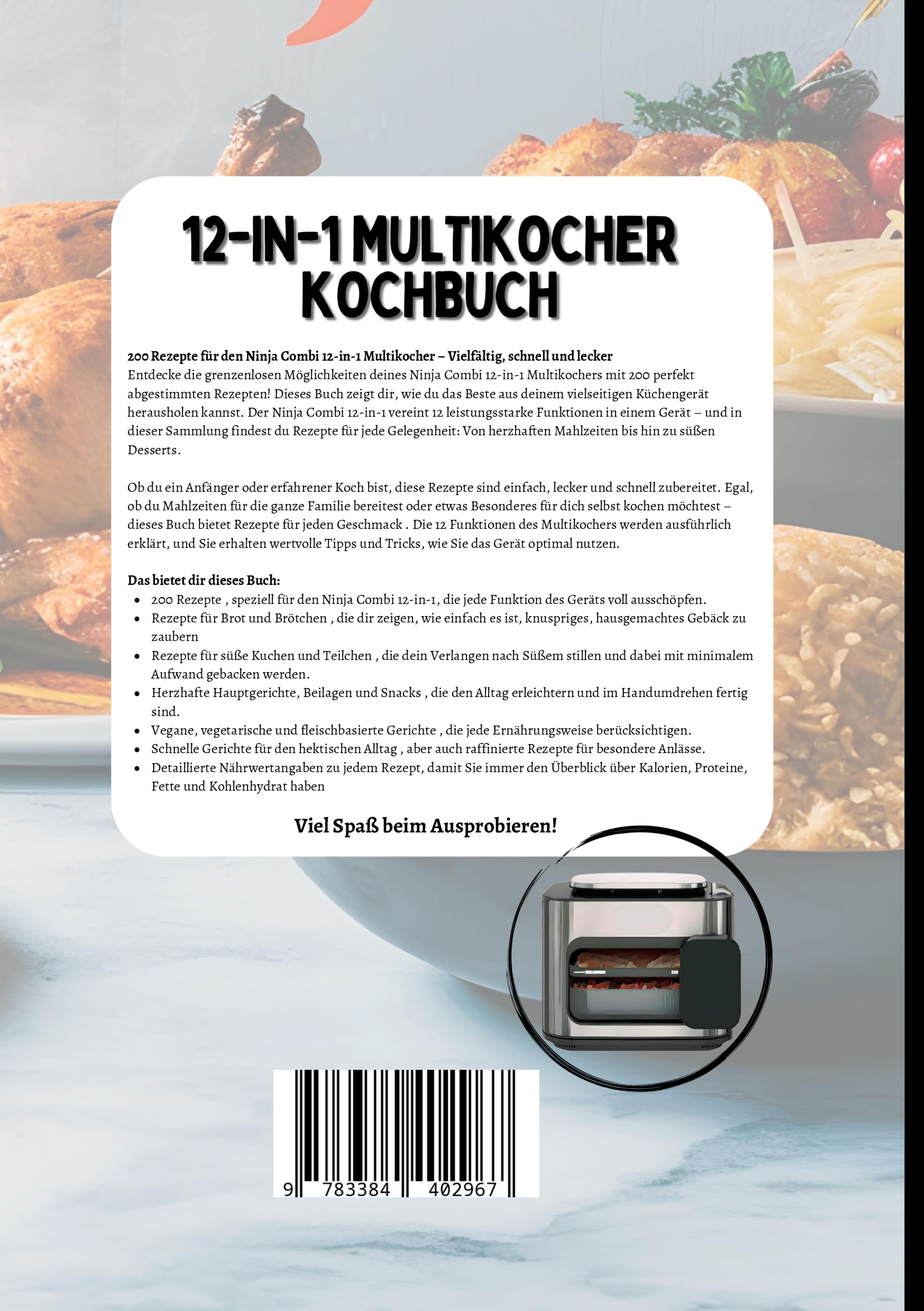 200 Rezepte für den Ninja Combi 12-in-1 Multikocher - Die ultimative Rezeptesammlung für schnelle und vielseitige Gerichte.Der Ninja Combi 12-in-1 Multikocher ist dein All-in-One-Gerät. 200 maßgeschneiderte Rezepte , die speziell für die vielfältigen Funktionen dieses Multikochers entwickelt wurden. Dank der 12 integrierten Kochfunktionen bietet der Ninja Combi grenzenlose Möglichkeiten, und dieses Buch zeigt dir, wie du sie voll ausschöpfst. Egal ob Anfänger oder erfahrener Koch.Was wirst du in diesem Buch finden:-Brotrezepte : Von klassischem Sauerteigbrot bis hin zu fluffigen Fladenbroten - der Ninja Combi macht es dir leicht, dein eigenes Brot zu backen.-Brötchenrezepte : Für das perfekte Frühstück oder den Snack zwischendurch - frische Brötchen in verschiedenen Variationen, knusprig und schnell gemacht.-Rezepte für süße Kuchen und Teilchen : Leckere Desserts wie Muffins, Kuchen und Teilchen.-Herzhafte Gerichte und Snacks : Hauptgerichte, Beilagen und schnelle Snacks, die ideal für den Alltag und gesunde Ernährung sind.Warum ist dieses Buch ein Muss für deinen Ninja Combi 12-in-1?1.Vielseitigkeit leicht gemacht : Du lernst, die unterschiedlichen Funktionen des Ninja Combi - wie Kombi-Mahlzeit, Heißluftfrittieren, Dämpfen und Backen - optimal zu nutzen.2.Familienfreundliche Rezepte : Ob Frühstück, Mittag- oder Abendessen.3.Zeitsparend und gesund : Viele Gerichte benötigen nur wenig Zubereitungszeit und sind durch die effiziente Nutzung des Multikochers besonders energie- und fettarm.4.Nährwertangaben für jedes Rezept : Kalorien, Proteine, Fette und Kohlenhydrate - du hast immer den Überblick, was auf deinem Teller landet.Warum der Ninja Combi 12-in-1?Der Ninja Combi ist nicht nur ein einfacher Multikocher, er vereint Backen, Braten, Grillen, Frittieren und vieles mehr in einem Gerät. Dank der einfachen Bedienung und der Kombifunktionen können mühelos gesunde und leckere Gerichte gezaubert werden, die innen saftig und außen knusprig sind. Du sparst Zeit, Platz und Energie , während du gleichzeitig kreative und abwechslungsreiche Mahlzeiten bereitest.