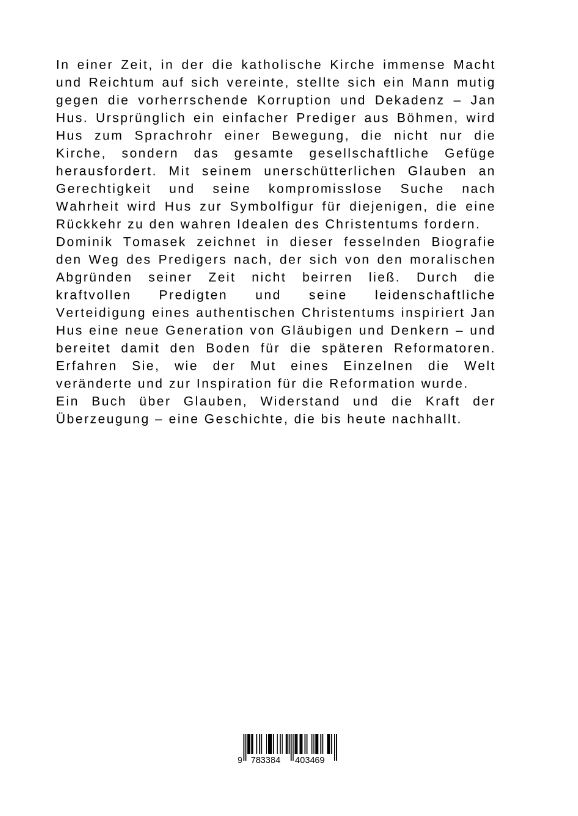 In einer Zeit, in der die katholische Kirche immense Macht und Reichtum auf sich vereinte, stellte sich ein Mann mutig gegen die vorherrschende Korruption und Dekadenz - Jan Hus. Ursprünglich ein einfacher Prediger aus Böhmen, wird Hus zum Sprachrohr einer Bewegung, die nicht nur die Kirche, sondern das gesamte gesellschaftliche Gefüge herausfordert. Mit seinem unerschütterlichen Glauben an Gerechtigkeit und seine kompromisslose Suche nach Wahrheit wird Hus zur Symbolfigur für diejenigen, die eine Rückkehr zu den wahren Idealen des Christentums fordern.Dominik Tomasek zeichnet in dieser fesselnden Biografie den Weg des Predigers nach, der sich von den moralischen Abgründen seiner Zeit nicht beirren ließ. Durch die kraftvollen Predigten und seine leidenschaftliche Verteidigung eines authentischen Christentums inspiriert Jan Hus eine neue Generation von Gläubigen und Denkern - und bereitet damit den Boden für die späteren Reformatoren. Erfahren Sie, wie der Mut eines Einzelnen die Welt veränderte und zur Inspiration für die Reformation wurde.Ein Buch über Glauben, Widerstand und die Kraft der Überzeugung - eine Geschichte, die bis heute nachhallt.