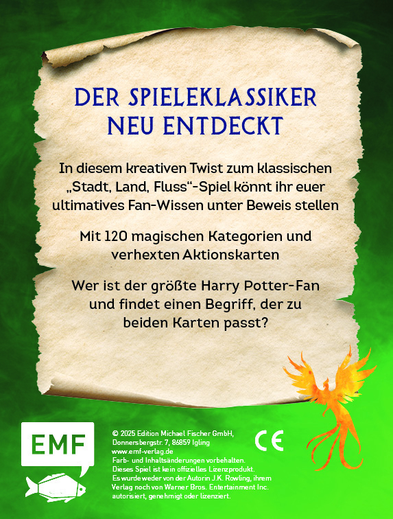 Tauche ein in die magische Welt der Zauberei. Das Kartenspiel funktioniert wie Stadt, Land, Fluss - nur anders und neu gedacht. Es gibt keine Buchstabenkarten, sondern zwei verschiedene Arten von Kategorien, die kombiniert werden. Die grüne Kategoriekarte gibt eine Eigenschaft an, die zur roten Kategoriekarte mit Charakteren, Räumen oder Ereignissen passen muss. Zum Beispiel muss ein Wort gefunden werden, was "typisch" für "Hermine" ist.