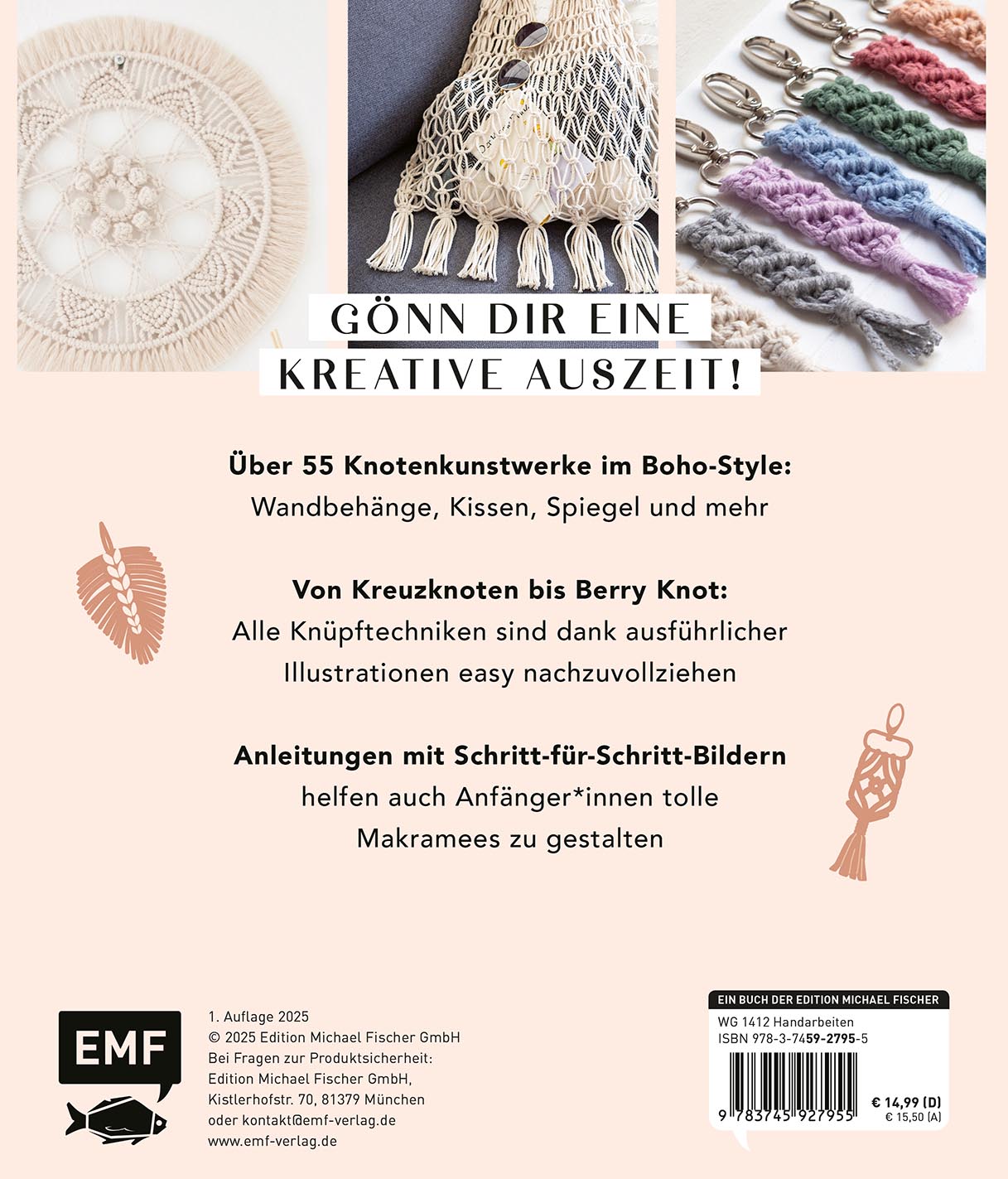 | Schlagworte | Kissen • Knotengrundlagen • Knüpfen, knoten, flechten • Knüpfprojekte • kreative Me-Time • Kreativzeit • Kreuzknoten • Lampe • Makrameeanleitungen • Makrameebuch • Makramee-Deko • Makramee in Runden • Makrameeknoten • Makramee-Liebe • Makrameeprojekte • makramee super easy • Projektsammlung • Spiegel • Wimpelkette • Windlichter |
