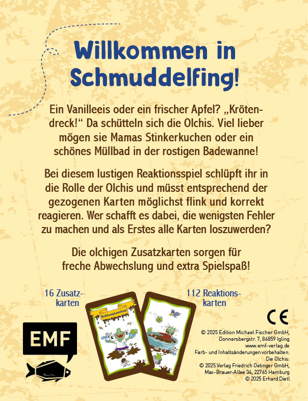 | Schlagworte | Erhard Dietl • Familienspiel • Ferien • Feuerstuhl • Geburtstagsgeschenk • Geschenk • Kartenspiel • Kinderspiel • Krötendreck • Mitbringsel • Müll • Olchi • Olchis • Reaktionsspiel • Schlamm • Schmuddelfing • schnelles spiel • Spielspaß • Urlaub • wenig Regeln • zum Mitnehmen |