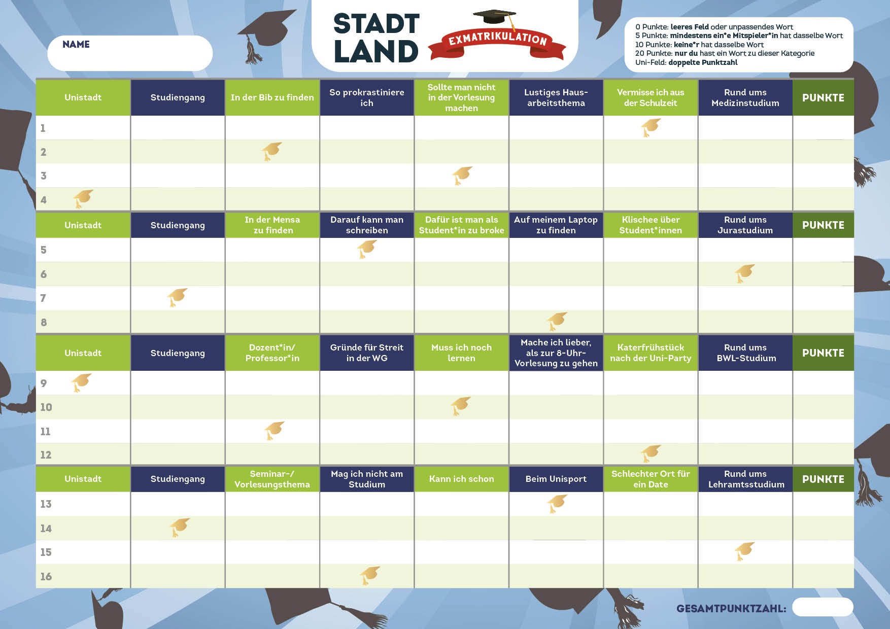 Stadt, Land, Exmatrikulation - Der Spieleklassiker für Studentinnen und Studenten
