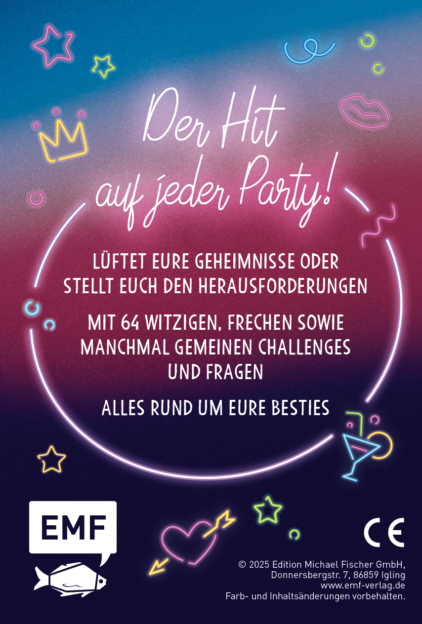 | Schlagworte | beste Freunde • Beste Freundin • best friends • BFF • Frech • Freundschaft • Geburtstagsfeier • Geburtstagsgeschenk • Geheimnisse • Geschenk • Gute Laune • Lachen • lernt euch kennen • Party • Partyspiel • Spaß • Spieleabend • Staunen • Wahrheit oder Pflicht • witzig |