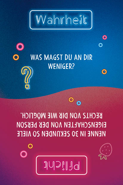 Wahrheit: "Welches Erlebnis in einer Freundschaft hat dich am meisten geprägt?" Pflicht: "Erzähle eine peinliche Geschichte über dich und dein*e Besties." Wahrheit oder Pflicht - seit jeher der Hit auf jeder Party! Jetzt im praktischen Kartenformat für zu Hause, unterwegs oder als Geschenk. Mit individuell auf Freundschaft zugeschnittenen Fragen und Aufgaben zum Spaß haben, Staunen und besser Kennenlernen. Wahrheit oder Pflicht - wie entscheidest du dich?