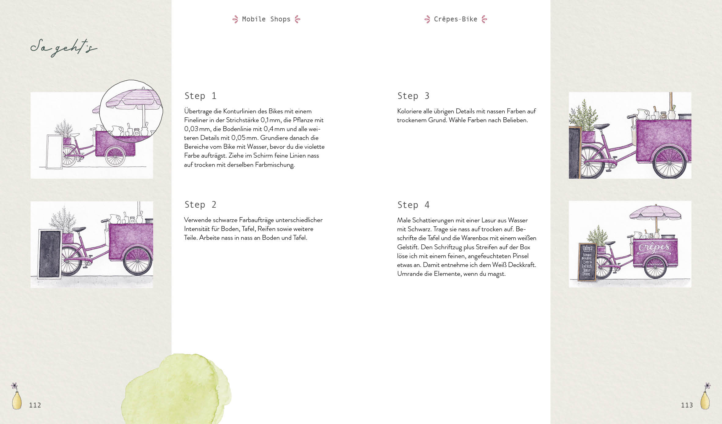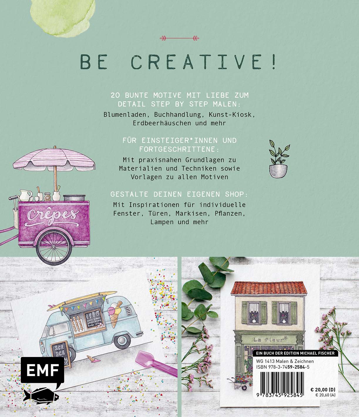 Nachdem du im Grundlagenteil lernst, wie du Mauern, Holzbalken, Dächer und Pflanzen mit dem Pinsel aufs Papier bringst, darfst du viele kleine Shops mit Watercolor Step by Step gestalten: von klassischen Shops wie einem Blumenladen oder einer Buchhandlung über besondere Läden wie einen Hutsalon oder Kunst-Kiosk bis hin zu mobilen Shops auf Rädern - es wird nicht langweilig! Die detailverliebten Motive ermöglichen dir, die Watercolor-Techniken zu erlernen und direkt praktisch umzusetzen. Ein perfektes Buch, um das Malen mit Watercolor von Grund auf zu lernen und beeindruckende Motive aufs Papier zu bringen. Viel Spaß beim "shoppen !