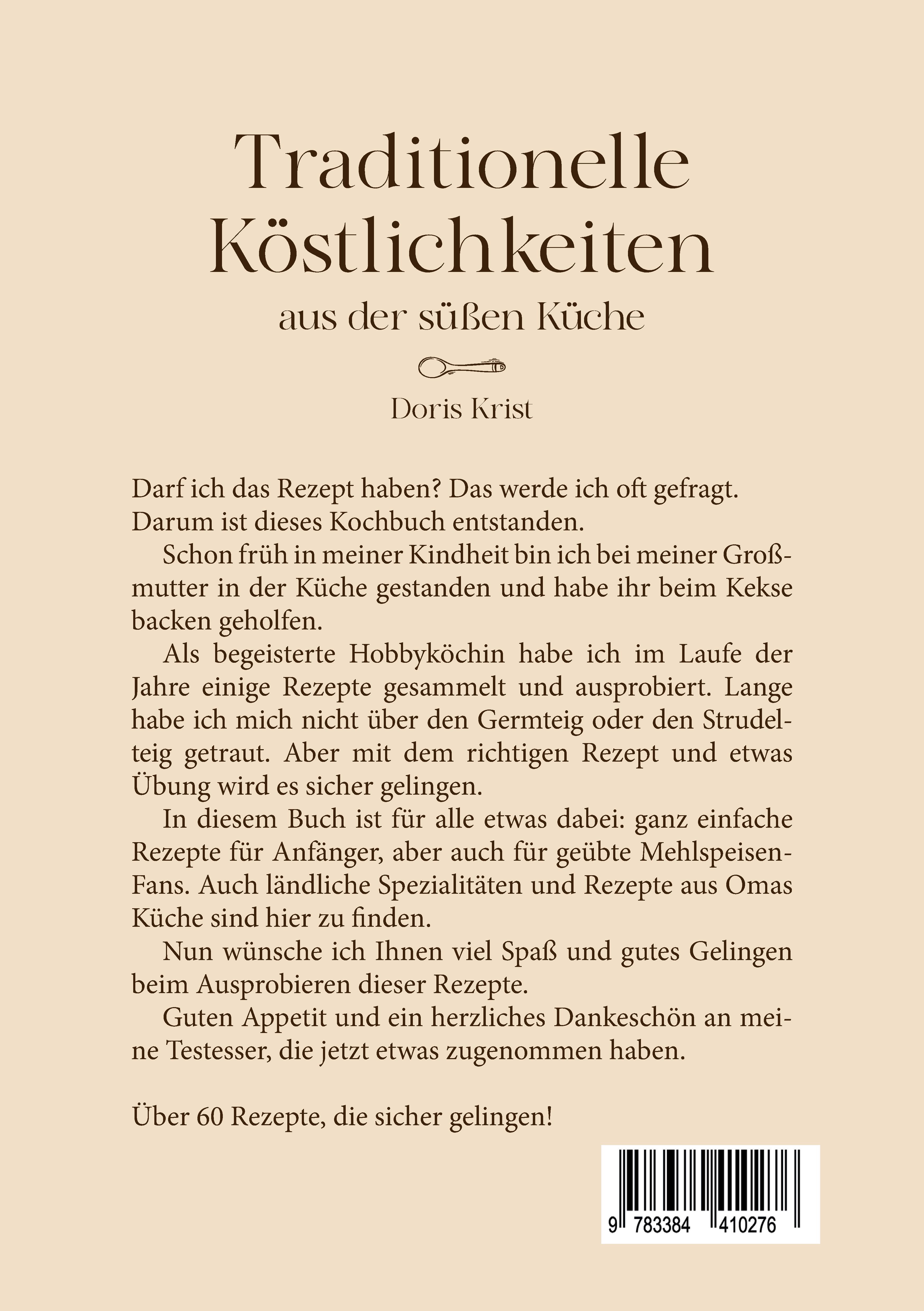 Darf ich das Rezept haben? Das werde ich oft gefragt. Darum ist dieses Kochbuch entstanden. Schon früh in meiner Kindheit bin ich bei meiner Großmutter in der Küche gestanden und habe ihr beim Kekse backen geholfen. Als begeisterte Hobbyköchin habe ich im Laufe der Jahre einige Rezepte gesammelt und ausprobiert. Lange habe ich mich nicht über den Germteig oder den Strudelteig getraut. Aber mit dem richtigen Rezept und etwas Übung wird es sicher gelingen.In diesem Buch ist für alle etwas dabei: ganz einfache Rezepte für Anfänger, aber auch für geübte Mehlspeisen-Fans. Auch ländliche Spezialitäten und Rezepte aus Omas Küche sind hier zu finden.Nun wünsche ich Ihnen viel Spaß und gutes Gelingen beim Ausprobieren dieser Rezepte.Guten Appetit und ein herzliches Dankeschön an meine Testesser, die jetzt etwas zugenommen haben.Über 60 Rezepte, die sicher gelingen!