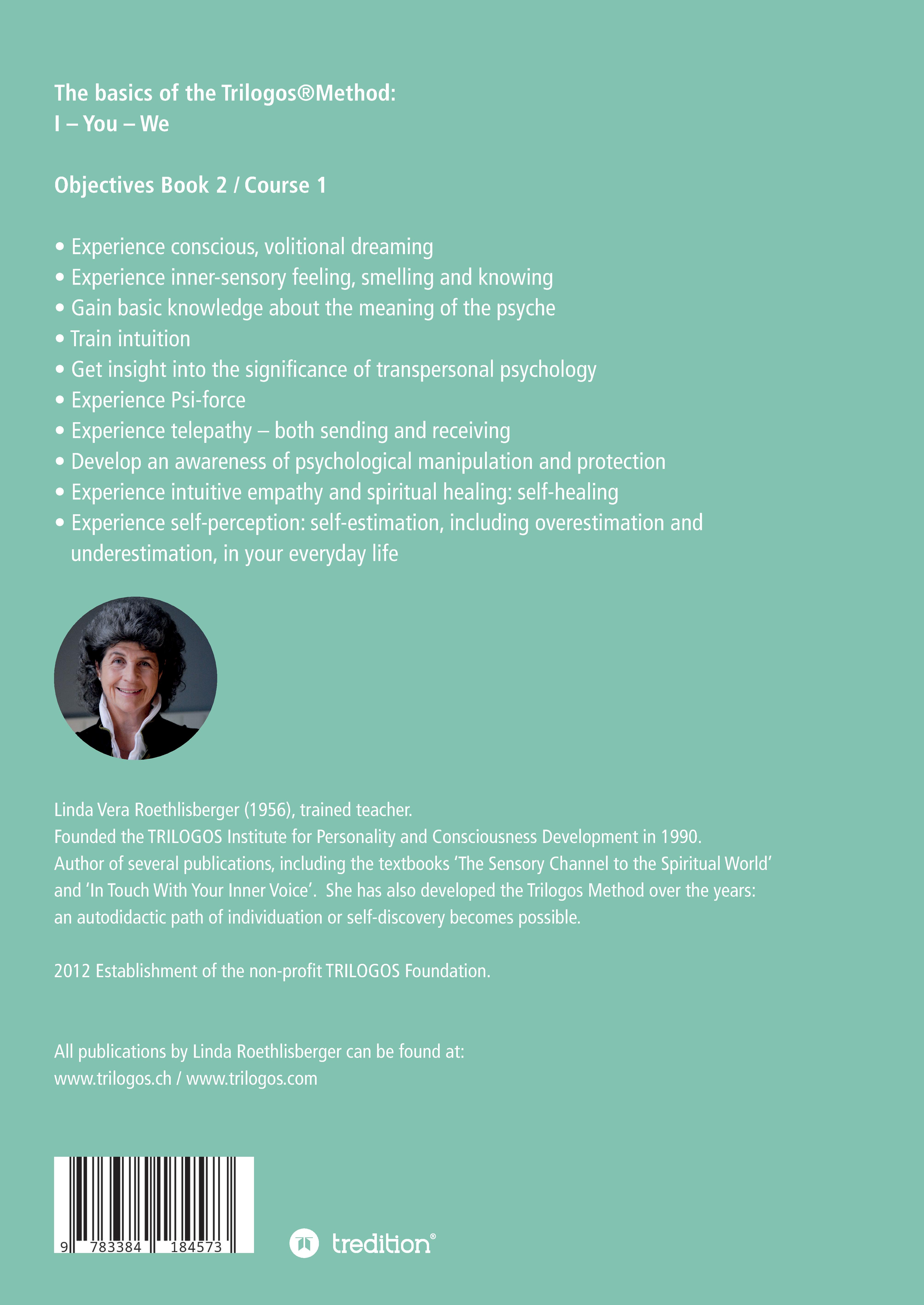 Linda Vera Roethlisberger (1956), ausgebildete Lehrerin. Parallel dazu bildete sie in Bern und Paris ihr Talent als Künstlerin aus. Ihre eigenen medialen Anlagen bildete sie weiter als Schülerin von Silvia Wallimann, Prof. Dr. Milan Ryzl und Gordon Higginson und arbeitet seither u.a. auch als Medium. 1990 Gründung vom Institut TRILOGOS für Persönlichkeits- und Bewusstseinsschulung. Autorin mehrerer Publikationen, so u.a. der Lehrbücher »Der sinnliche Draht zur geistigen Welt« und »Im Kontakt mit der inneren Stimme«. Weiter entwickelte sie über die Jahre hinweg die TRILOGOS®Methode: ein autodidaktischer Individuations- oder Selbstfindungsweg wird möglich. 2012 Gründung der gemeinnützigen TRILOGOS Stiftung.