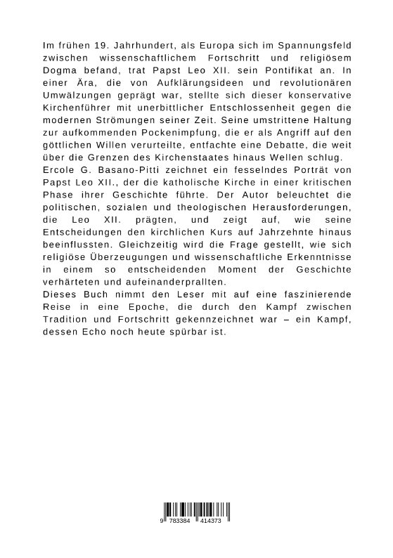 Im frühen 19. Jahrhundert, als Europa sich im Spannungsfeld zwischen wissenschaftlichem Fortschritt und religiösem Dogma befand, trat Papst Leo XII. sein Pontifikat an. In einer Ära, die von Aufklärungsideen und revolutionären Umwälzungen geprägt war, stellte sich dieser konservative Kirchenführer mit unerbittlicher Entschlossenheit gegen die modernen Strömungen seiner Zeit. Seine umstrittene Haltung zur aufkommenden Pockenimpfung, die er als Angriff auf den göttlichen Willen verurteilte, entfachte eine Debatte, die weit über die Grenzen des Kirchenstaates hinaus Wellen schlug.Ercole G. Basano-Pitti zeichnet ein fesselndes Porträt von Papst Leo XII., der die katholische Kirche in einer kritischen Phase ihrer Geschichte führte. Der Autor beleuchtet die politischen, sozialen und theologischen Herausforderungen, die Leo XII. prägten, und zeigt auf, wie seine Entscheidungen den kirchlichen Kurs auf Jahrzehnte hinaus beeinflussten. Gleichzeitig wird die Frage gestellt, wie sich religiöse Überzeugungen und wissenschaftliche Erkenntnisse in einem so entscheidenden Moment der Geschichte verhärteten und aufeinanderprallten.Dieses Buch nimmt den Leser mit auf eine faszinierende Reise in eine Epoche, die durch den Kampf zwischen Tradition und Fortschritt gekennzeichnet war - ein Kampf, dessen Echo noch heute spürbar ist.