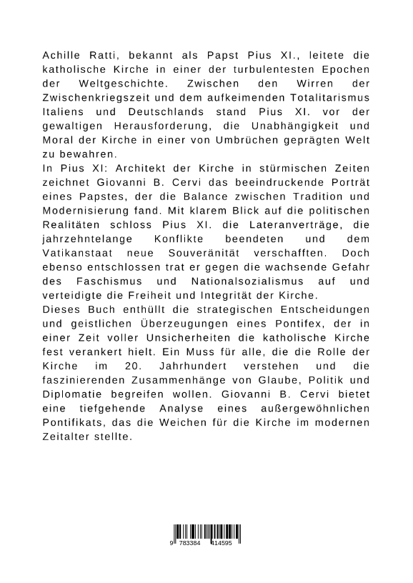 Achille Ratti, bekannt als Papst Pius XI., leitete die katholische Kirche in einer der turbulentesten Epochen der Weltgeschichte. Zwischen den Wirren der Zwischenkriegszeit und dem aufkeimenden Totalitarismus Italiens und Deutschlands stand Pius XI. vor der gewaltigen Herausforderung, die Unabhängigkeit und Moral der Kirche in einer von Umbrüchen geprägten Welt zu bewahren.In Pius XI: Architekt der Kirche in stürmischen Zeiten zeichnet Giovanni B. Cervi das beeindruckende Porträt eines Papstes, der die Balance zwischen Tradition und Modernisierung fand. Mit klarem Blick auf die politischen Realitäten schloss Pius XI. die Lateranverträge, die jahrzehntelange Konflikte beendeten und dem Vatikanstaat neue Souveränität verschafften. Doch ebenso entschlossen trat er gegen die wachsende Gefahr des Faschismus und Nationalsozialismus auf und verteidigte die Freiheit und Integrität der Kirche.Dieses Buch enthüllt die strategischen Entscheidungen und geistlichen Überzeugungen eines Pontifex, der in einer Zeit voller Unsicherheiten die katholische Kirche fest verankert hielt. Ein Muss für alle, die die Rolle der Kirche im 20. Jahrhundert verstehen und die faszinierenden Zusammenhänge von Glaube, Politik und Diplomatie begreifen wollen. Giovanni B. Cervi bietet eine tiefgehende Analyse eines außergewöhnlichen Pontifikats, das die Weichen für die Kirche im modernen Zeitalter stellte.