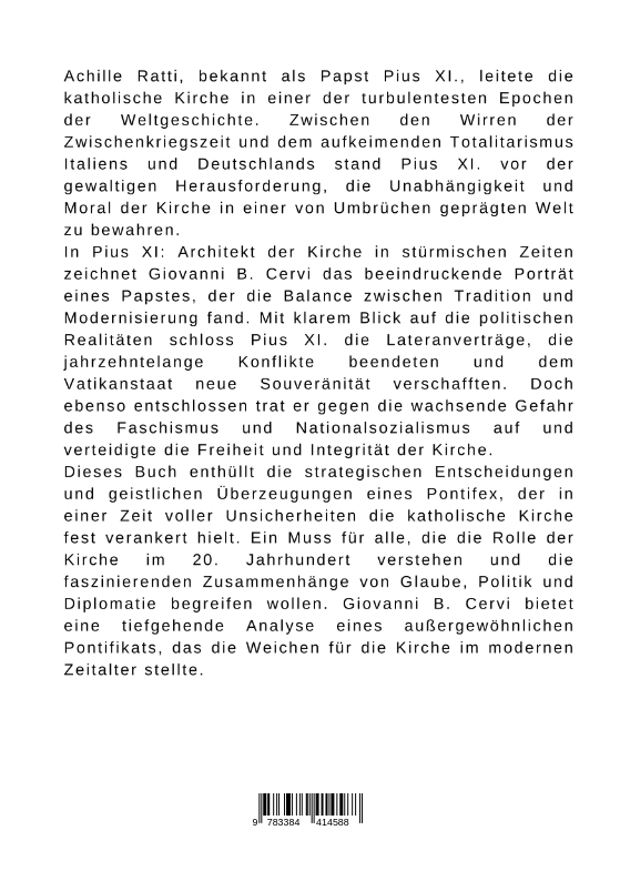 Achille Ratti, bekannt als Papst Pius XI., leitete die katholische Kirche in einer der turbulentesten Epochen der Weltgeschichte. Zwischen den Wirren der Zwischenkriegszeit und dem aufkeimenden Totalitarismus Italiens und Deutschlands stand Pius XI. vor der gewaltigen Herausforderung, die Unabhängigkeit und Moral der Kirche in einer von Umbrüchen geprägten Welt zu bewahren.In Pius XI: Architekt der Kirche in stürmischen Zeiten zeichnet Giovanni B. Cervi das beeindruckende Porträt eines Papstes, der die Balance zwischen Tradition und Modernisierung fand. Mit klarem Blick auf die politischen Realitäten schloss Pius XI. die Lateranverträge, die jahrzehntelange Konflikte beendeten und dem Vatikanstaat neue Souveränität verschafften. Doch ebenso entschlossen trat er gegen die wachsende Gefahr des Faschismus und Nationalsozialismus auf und verteidigte die Freiheit und Integrität der Kirche.Dieses Buch enthüllt die strategischen Entscheidungen und geistlichen Überzeugungen eines Pontifex, der in einer Zeit voller Unsicherheiten die katholische Kirche fest verankert hielt. Ein Muss für alle, die die Rolle der Kirche im 20. Jahrhundert verstehen und die faszinierenden Zusammenhänge von Glaube, Politik und Diplomatie begreifen wollen. Giovanni B. Cervi bietet eine tiefgehende Analyse eines außergewöhnlichen Pontifikats, das die Weichen für die Kirche im modernen Zeitalter stellte.