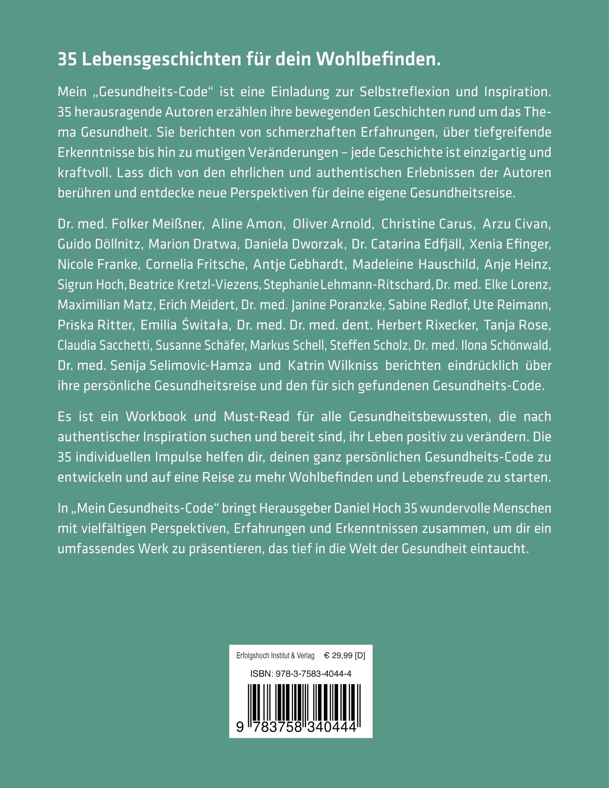 Dr. med. Folker Meißner, Aline Amon, Oliver Arnold, Christine Carus, Arzu Civan, Guido Döllnitz, Marion Dratwa, Daniela Dworzak, Dr. Catarina Edfjäll, Xenia Efinger, Nicole Franke, Cornelia Fritsche, Antje Gebhardt, Madeleine Hauschild, Anje Heinz, Sigrun Hoch, Beatrice Kretzl-Viezens, Stephanie Lehmann, Dr. Elke Lorenz, Maximilian Matz, Erich Meidert, Dr. Janine Poranzke, Sabine Redlof, Ute Reimann, Priska Ritter, Dr. med. Dr. med. dent. Herbert Rixecker, Tanja Rose, Claudia Sacchetti, Susanne Schäfer, Markus Schell, Steffen Scholz, Dr. Ilona Schönwald, Dr. Senija Selimovic-Hamza, Emilia Switala und Katrin Wilkniss berichten eindrücklich über ihre persönliche Gesundheitsreise und den für sich gefundenen Gesundheits-Code.