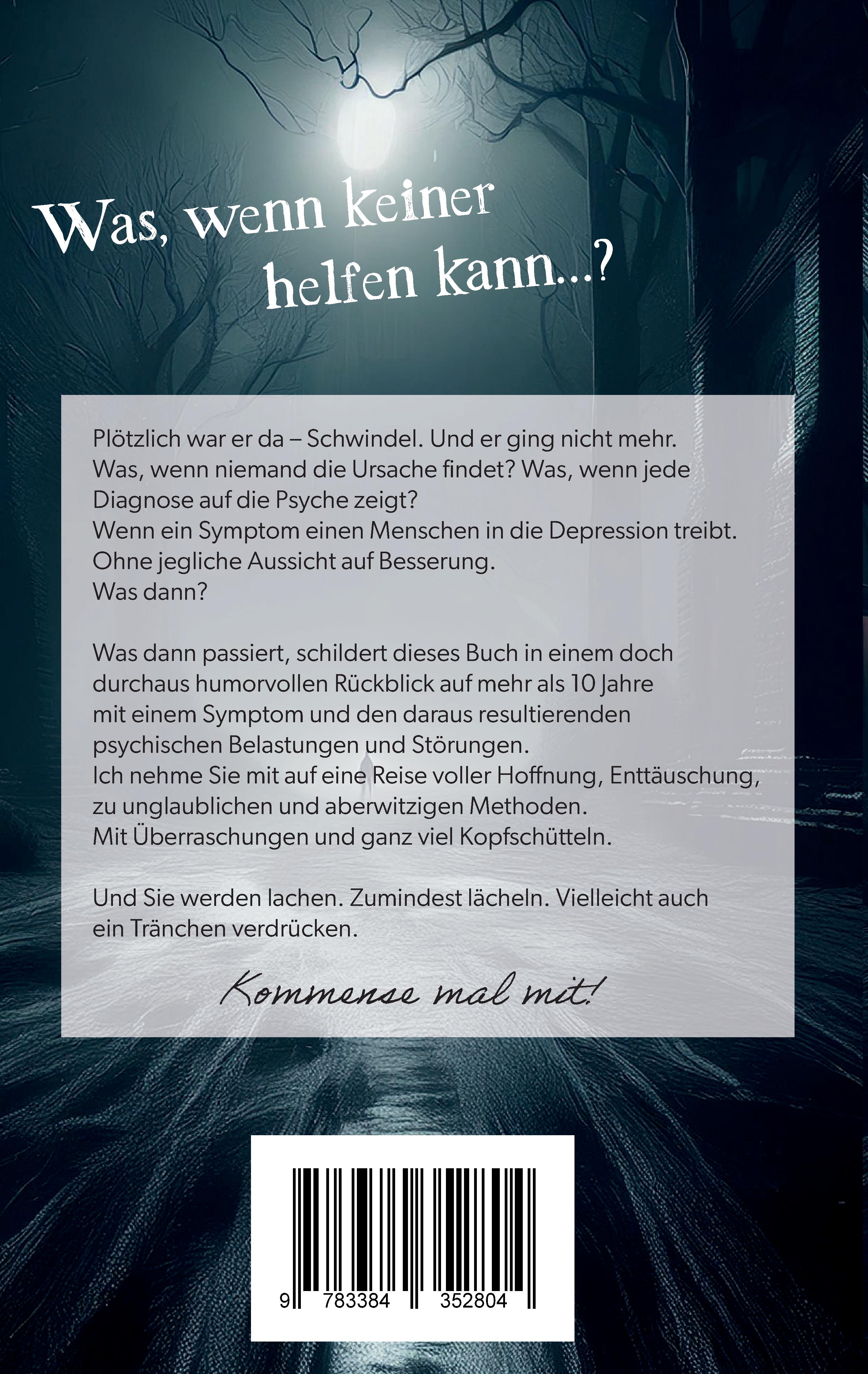 Was, wenn keiner helfen kann...?Plötzlich war er da - Schwindel. Und er ging nicht mehr.Was, wenn niemand die Ursache findet? Was, wenn jedeDiagnose auf die Psyche zeigt?Wenn ein Symptom einen Menschen in die Depression treibt.Ohne jegliche Aussicht auf Besserung.Was dann?Was dann passiert, schildert dieses Buch in einem dochdurchaus humorvollen Rückblick auf mehr als 10 Jahremit einem Symptom und den daraus resultierendenpsychischen Belastungen und Störungen.Ich nehme Sie mit auf eine Reise voller Hoffnung, Enttäuschung,zu unglaublichen und aberwitzigen Methoden. Mit Überraschungen und ganz viel Kopfschütteln.Und Sie werden lachen. Zumindest lächeln. Vielleicht auchein Tränchen verdrücken.Kommense mal mit!