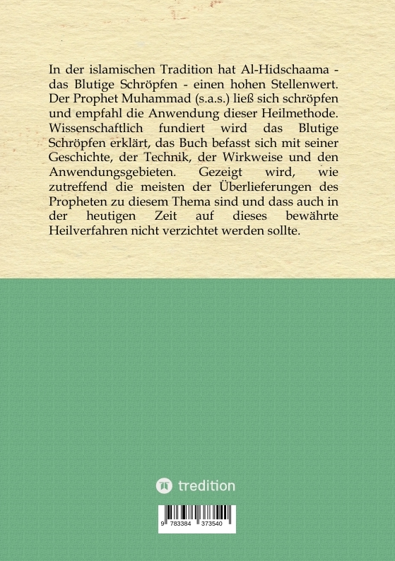 | Schlagworte | Evidenzbasierte Medizin • Hacamat • Hidschaama • hijama • Lehrbuch des Blutigen Schröpfens • Medizin des Propheten • Naturheilverfahren • Sunna |