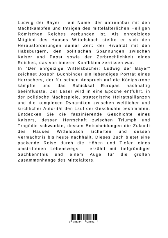 Ludwig der Bayer - ein Name, der untrennbar mit den Machtkämpfen und Intrigen des mittelalterlichen Heiligen Römischen Reiches verbunden ist. Als ehrgeiziges Mitglied des Hauses Wittelsbach stellte er sich den Herausforderungen seiner Zeit: der Rivalität mit den Habsburgern, den politischen Spannungen zwischen Kaiser und Papst sowie der Zerbrechlichkeit eines Reiches, das von inneren Konflikten zerrissen war.In "Der ehrgeizige Wittelsbacher: Ludwig der Bayer" zeichnet Joseph Buchbinder ein lebendiges Porträt eines Herrschers, der für seinen Anspruch auf die Königskrone kämpfte und das Schicksal Europas nachhaltig beeinflusste. Der Leser wird in eine Epoche entführt, in der politische Machtspiele, strategische Heiratsallianzen und die komplexen Dynamiken zwischen weltlicher und kirchlicher Autorität den Lauf der Geschichte bestimmten.Entdecken Sie die faszinierende Geschichte eines Kaisers, dessen Herrschaft zwischen Triumph und Tragödie schwankte, dessen Entscheidungen die Zukunft des Hauses Wittelsbach sicherten und dessen Vermächtnis bis heute nachhallt. Dieses Buch bietet eine packende Reise durch die Höhen und Tiefen eines umstrittenen Lebenswegs - erzählt mit tiefgründiger Sachkenntnis und einem Auge für die großen Zusammenhänge des Mittelalters.