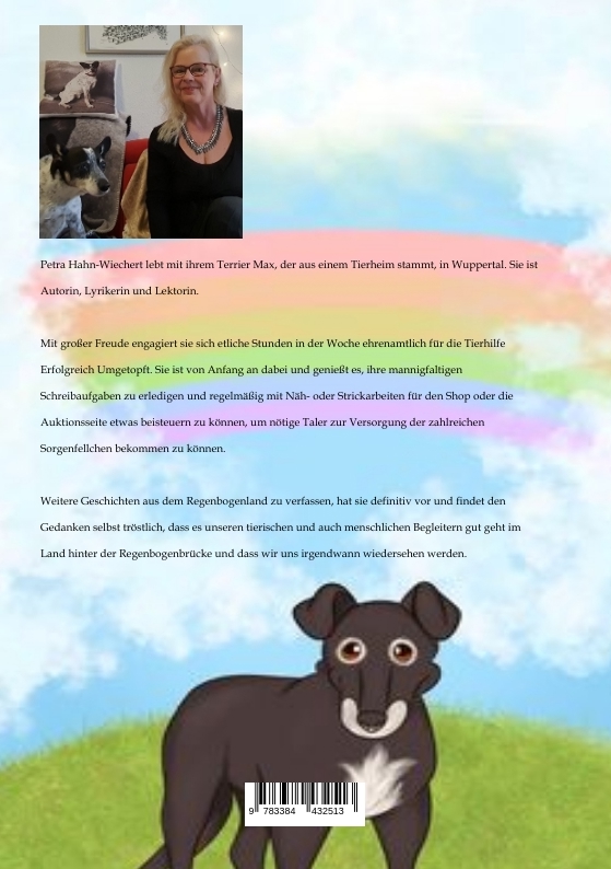 Petra Hahn-Wiechert lebt mit ihrem Terrier Max, der aus einem Tierheim stammt, in Wuppertal. Sie ist Autorin, Lyrikerin und Lektorin. Mit großer Freude engagiert sie sich etliche Stunden in der Woche ehrenamtlich für die Tierhilfe Erfolgreich Umgetopft. Sie ist von Anfang an dabei und genießt es, ihre mannigfaltigen Schreibaufgaben zu erledigen und regelmäßig mit Näh- oder Strickarbeiten für den Shop oder die Auktionsseite etwas beisteuern zu können, um nötige Taler zur Versorgung der zahlreichen Sorgenfellchen bekommen zu können. Weitere Geschichten aus dem Regenbogenland zu verfassen, hat sie definitiv vor und findet den Gedanken selbst tröstlich, dass es unseren tierischen und auch menschlichen Begleitern gut geht im Land hinter der Regenbogenbrücke und dass wir uns irgendwann wiedersehen werden.