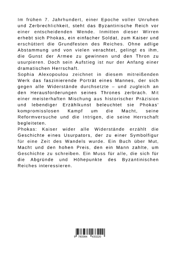 Im frühen 7. Jahrhundert, einer Epoche voller Unruhen und Zerbrechlichkeit, steht das Byzantinische Reich vor einer entscheidenden Wende. Inmitten dieser Wirren erhebt sich Phokas, ein einfacher Soldat, zum Kaiser und erschüttert die Grundfesten des Reiches. Ohne adlige Abstammung und von vielen verachtet, gelingt es ihm, die Gunst der Armee zu gewinnen und den Thron zu usurpieren. Doch sein Aufstieg ist nur der Anfang einer dramatischen Herrschaft.Sophia Alexopoulou zeichnet in diesem mitreißenden Werk das faszinierende Porträt eines Mannes, der sich gegen alle Widerstände durchsetzte - und zugleich an den Herausforderungen seines Thrones zerbrach. Mit einer meisterhaften Mischung aus historischer Präzision und lebendiger Erzählkunst beleuchtet sie Phokas' kompromisslosen Kampf um die Macht, seine Reformversuche und die Intrigen, die seine Herrschaft begleiteten.Phokas: Kaiser wider alle Widerstände erzählt die Geschichte eines Usurpators, der zu einer Symbolfigur für eine Zeit des Wandels wurde. Ein Buch über Mut, Macht und den hohen Preis, den ein Mann zahlte, um Geschichte zu schreiben. Ein Muss für alle, die sich für die Abgründe und Höhepunkte des Byzantinischen Reiches interessieren.