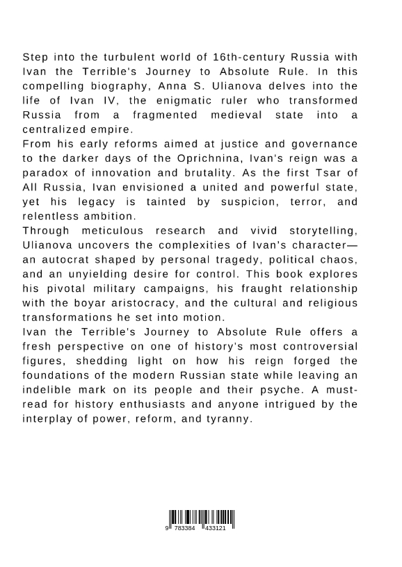 Step into the turbulent world of 16th-century Russia with Ivan the Terrible's Journey to Absolute Rule. In this compelling biography, Anna S. Ulianova delves into the life of Ivan IV, the enigmatic ruler who transformed Russia from a fragmented medieval state into a centralized empire.From his early reforms aimed at justice and governance to the darker days of the Oprichnina, Ivan's reign was a paradox of innovation and brutality. As the first Tsar of All Russia, Ivan envisioned a united and powerful state, yet his legacy is tainted by suspicion, terror, and relentless ambition.Through meticulous research and vivid storytelling, Ulianova uncovers the complexities of Ivan's character-an autocrat shaped by personal tragedy, political chaos, and an unyielding desire for control. This book explores his pivotal military campaigns, his fraught relationship with the boyar aristocracy, and the cultural and religious transformations he set into motion.Ivan the Terrible's Journey to Absolute Rule offers a fresh perspective on one of history's most controversial figures, shedding light on how his reign forged the foundations of the modern Russian state while leaving an indelible mark on its people and their psyche. A must-read for history enthusiasts and anyone intrigued by the interplay of power, reform, and tyranny.