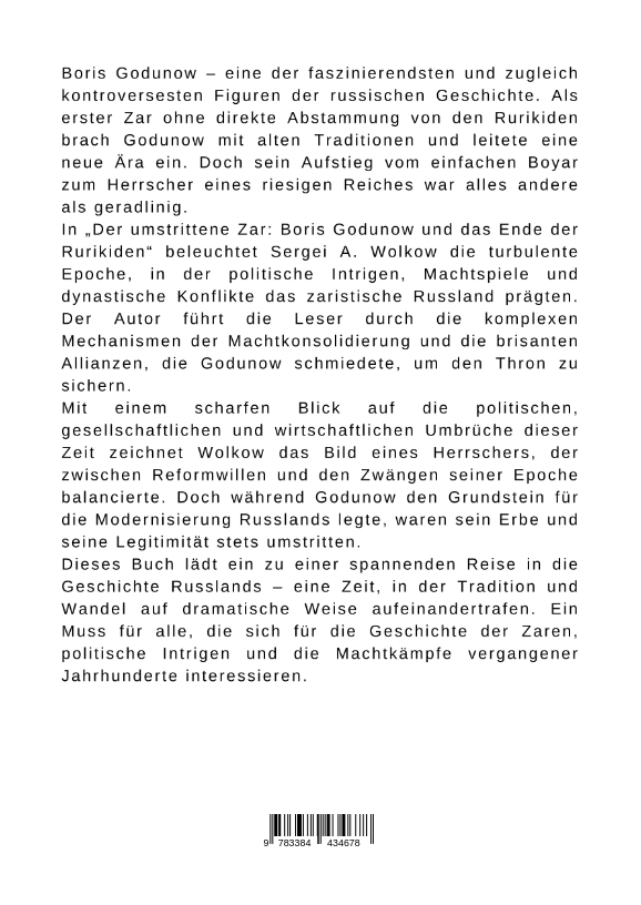 Boris Godunow - eine der faszinierendsten und zugleich kontroversesten Figuren der russischen Geschichte. Als erster Zar ohne direkte Abstammung von den Rurikiden brach Godunow mit alten Traditionen und leitete eine neue Ära ein. Doch sein Aufstieg vom einfachen Boyar zum Herrscher eines riesigen Reiches war alles andere als geradlinig.In "Der umstrittene Zar: Boris Godunow und das Ende der Rurikiden" beleuchtet Sergei A. Wolkow die turbulente Epoche, in der politische Intrigen, Machtspiele und dynastische Konflikte das zaristische Russland prägten. Der Autor führt die Leser durch die komplexen Mechanismen der Machtkonsolidierung und die brisanten Allianzen, die Godunow schmiedete, um den Thron zu sichern.Mit einem scharfen Blick auf die politischen, gesellschaftlichen und wirtschaftlichen Umbrüche dieser Zeit zeichnet Wolkow das Bild eines Herrschers, der zwischen Reformwillen und den Zwängen seiner Epoche balancierte. Doch während Godunow den Grundstein für die Modernisierung Russlands legte, waren sein Erbe und seine Legitimität stets umstritten.Dieses Buch lädt ein zu einer spannenden Reise in die Geschichte Russlands - eine Zeit, in der Tradition und Wandel auf dramatische Weise aufeinandertrafen. Ein Muss für alle, die sich für die Geschichte der Zaren, politische Intrigen und die Machtkämpfe vergangener Jahrhunderte interessieren.