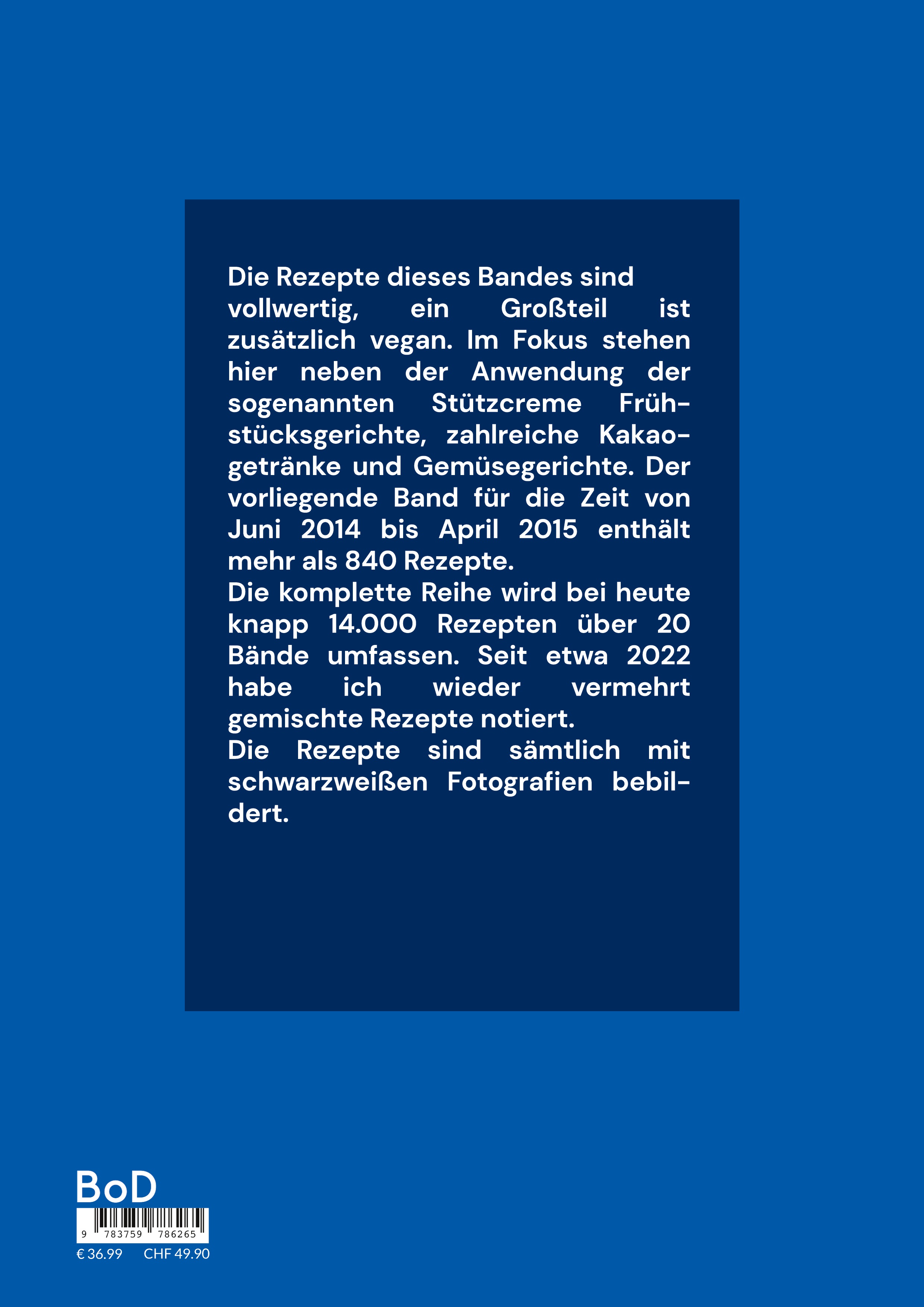 Die Rezepte dieses Bandes sind vollwertig, ein Großteil ist zusätzlich vegan. Im Fokus dieses Bandes stehen neben der Anwendung der sogenannten Stützcreme , Frühstücksgerichte, zahlreiche Kakaogetränke und Gemüsegerichte. Der vorliegende Band für die Zeit von Juni 2014 bis xxx enthält mehr als 800 Rezepte.