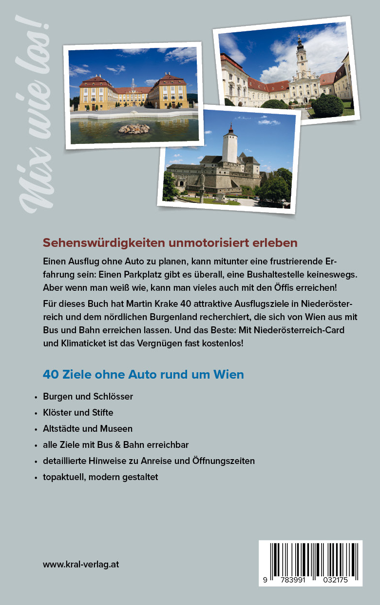 Einen Ausflug ohne Auto zu planen, kann mitunter eine frustrierende Erfahrung sein: Einen Parkplatz gibt es überall, eine Bushaltestelle keineswegs. Aber wenn man weiß wie, kann man vieles auch mit den Öffis erreichen!Für diesen Ausflugsführer hat Martin Krake 40 attraktive Ausflugsziele in Niederösterreich und dem nördlichen Burgenland recherchiert, die sich von Wien aus mit Bus und Bahn erreichen lassen. Und das Beste: Mit Klimaticket und Niederösterreich- Card ist das Vergnügen fast kostenlos!