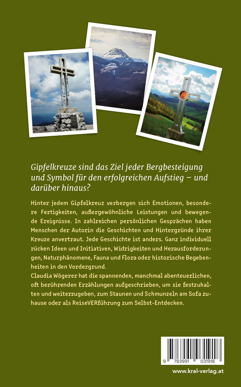 Gipfelkreuze sind das Ziel jeder Bergbesteigung und Symbol für den erfolgreichen Aufstieg und darüber hinaus?Hinter jedem Gipfelkreuz verbergen sich Emotionen, besondere Fertigkeiten, außergewöhnliche Leistungen und bewegende Ereignisse. In zahlreichen persönlichen Gesprächen haben Menschen der Autorin die Geschichten und Hintergründe ihrer Kreuze anvertraut. Jede Geschichte ist anders. Ganz individuell rücken Ideen und Initiativen, Widrigkeiten und Herausforderungen, Naturphänomene, Fauna und Flora oder historische Begebenheiten in den Vordergrund. Claudia Wögerer hat die spannenden, manchmal abenteuerlichen, oft berührenden Erzählungen aufgeschrieben um sie festzuhalten und weiterzugeben, zum Staunen und Schmunzeln am Sofa zuhause oder als ReiseVERführung zum Selbst-Entdecken.