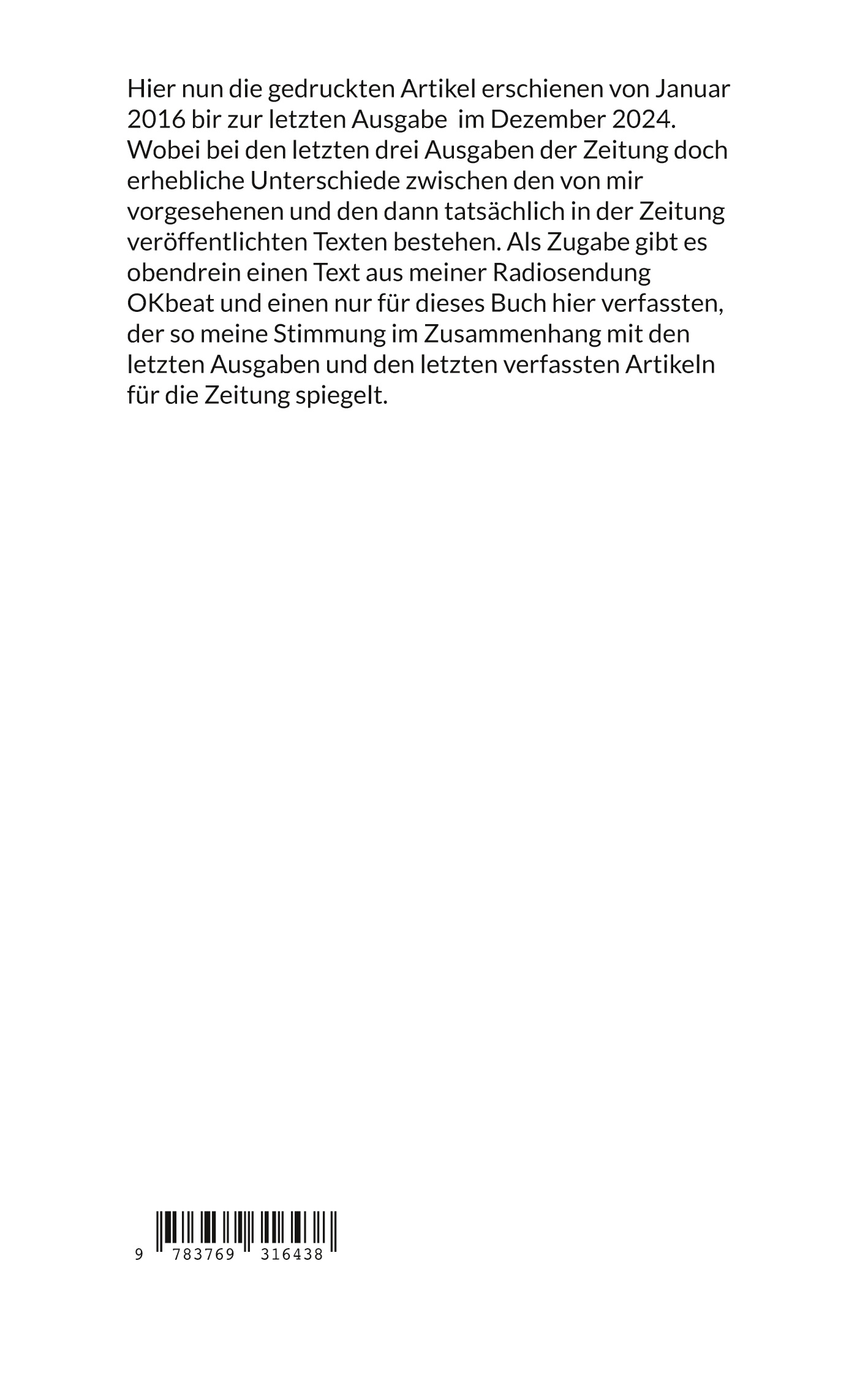 Hier nun die gedruckten Artikel erschienen von Januar 2016 bis zur letzten Ausgabe im Dezember 2024. Wobei bei den letzten drei Ausgaben der Zeitung doch erhebliche Unterschiede zwischen den von mir vorgesehenen und den dann tatsächlich in der Zeitung veröffentlichten Texten bestehen. Als Zugabe gibt es obendrein einen Text aus meiner Radiosendung OKbeat und einen nur für dieses Buch hier verfassten, der so meine Stimmung im Zusammenhang mit den letzten Ausgaben und den letzten verfassten Artikeln für die Zeitung spiegelt.