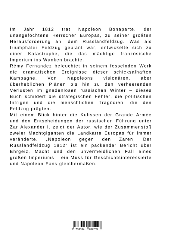 Im Jahr 1812 trat Napoleon Bonaparte, der unangefochtene Herrscher Europas, zu seiner größten Herausforderung an: dem Russlandfeldzug. Was als triumphaler Feldzug geplant war, entwickelte sich zu einer Katastrophe, die das mächtige französische Imperium ins Wanken brachte.Rémy Fernandez beleuchtet in seinem fesselnden Werk die dramatischen Ereignisse dieser schicksalhaften Kampagne. Von Napoleons visionären, aber überheblichen Plänen bis hin zu den verheerenden Verlusten im gnadenlosen russischen Winter - dieses Buch schildert die strategischen Fehler, die politischen Intrigen und die menschlichen Tragödien, die den Feldzug prägten.Mit einem Blick hinter die Kulissen der Grande Armée und den Entscheidungen der russischen Führung unter Zar Alexander I. zeigt der Autor, wie der Zusammenstoß zweier Machtgiganten die Landkarte Europas für immer veränderte. "Napoleon gegen den Zaren: Der Russlandfeldzug 1812" ist ein packender Bericht über Ehrgeiz, Macht und den unvermeidlichen Fall eines großen Imperiums - ein Muss für Geschichtsinteressierte und Napoleon-Fans gleichermaßen.