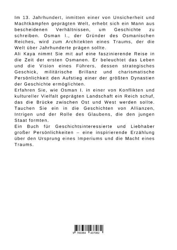 Im 13. Jahrhundert, inmitten einer von Unsicherheit und Machtkämpfen geprägten Welt, erhebt sich ein Mann aus bescheidenen Verhältnissen, um Geschichte zu schreiben. Osman I., der Gründer des Osmanischen Reiches, wird zum Architekten eines Traums, der die Welt über Jahrhunderte prägen sollte.Ali Kaya nimmt Sie mit auf eine faszinierende Reise in die Zeit der ersten Osmanen. Er beleuchtet das Leben und die Vision eines Führers, dessen strategisches Geschick, militärische Brillanz und charismatische Persönlichkeit den Aufstieg einer der größten Dynastien der Geschichte ermöglichten.Erfahren Sie, wie Osman I. in einer von Konflikten und kultureller Vielfalt geprägten Landschaft ein Reich schuf, das die Brücke zwischen Ost und West werden sollte. Tauchen Sie ein in die Geschichten von Allianzen, Intrigen und der Rolle des Glaubens, die den jungen Staat formten.Ein Buch für Geschichtsinteressierte und Liebhaber großer Persönlichkeiten - eine inspirierende Erzählung über den Ursprung eines Imperiums und die Macht eines Traums.