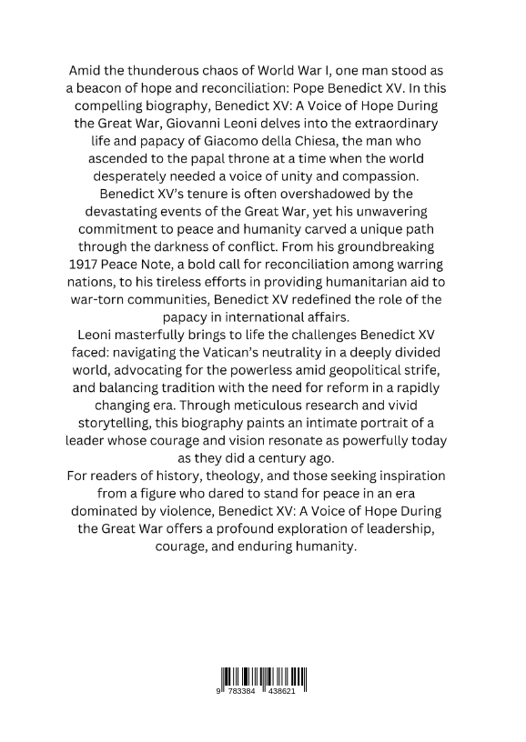 Amid the thunderous chaos of World War I, one man stood as a beacon of hope and reconciliation: Pope Benedict XV. In this compelling biography, Benedict XV: A Voice of Hope During the Great War, Giovanni Leoni delves into the extraordinary life and papacy of Giacomo della Chiesa, the man who ascended to the papal throne at a time when the world desperately needed a voice of unity and compassion.Benedict XV's tenure is often overshadowed by the devastating events of the Great War, yet his unwavering commitment to peace and humanity carved a unique path through the darkness of conflict. From his groundbreaking 1917 Peace Note, a bold call for reconciliation among warring nations, to his tireless efforts in providing humanitarian aid to war-torn communities, Benedict XV redefined the role of the papacy in international affairs.Leoni masterfully brings to life the challenges Benedict XV faced: navigating the Vatican's neutrality in a deeply divided world, advocating for the powerless amid geopolitical strife, and balancing tradition with the need for reform in a rapidly changing era. Through meticulous research and vivid storytelling, this biography paints an intimate portrait of a leader whose courage and vision resonate as powerfully today as they did a century ago.For readers of history, theology, and those seeking inspiration from a figure who dared to stand for peace in an era dominated by violence, Benedict XV: A Voice of Hope During the Great War offers a profound exploration of leadership, courage, and enduring humanity.