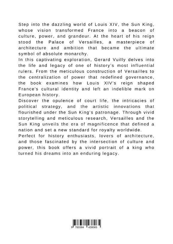 Step into the dazzling world of Louis XIV, the Sun King, whose vision transformed France into a beacon of culture, power, and grandeur. At the heart of his reign stood the Palace of Versailles, a masterpiece of architecture and ambition that became the ultimate symbol of absolute monarchy.In this captivating exploration, Gerard Vuilly delves into the life and legacy of one of history's most influential rulers. From the meticulous construction of Versailles to the centralization of power that redefined governance, the book examines how Louis XIV's reign shaped France's cultural identity and left an indelible mark on European history.Discover the opulence of court life, the intricacies of political strategy, and the artistic innovations that flourished under the Sun King's patronage. Through vivid storytelling and meticulous research, Versailles and the Sun King unveils the era of magnificence that defined a nation and set a new standard for royalty worldwide.Perfect for history enthusiasts, lovers of architecture, and those fascinated by the intersection of culture and power, this book offers a vivid portrait of a king who turned his dreams into an enduring legacy.