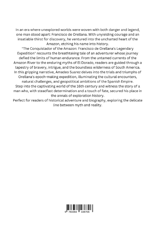 In an era where unexplored worlds were woven with both danger and legend, one man stood apart: Francisco de Orellana. With unyielding courage and an insatiable thirst for discovery, he ventured into the uncharted heart of the Amazon, etching his name into history."The Conquistador of the Amazon: Francisco de Orellana's Legendary Expedition" recounts the breathtaking tale of an adventurer whose journey defied the limits of human endurance. From the untamed currents of the Amazon River to the enduring myths of El Dorado, readers are guided through a tapestry of bravery, intrigue, and the boundless wilderness of South America.In this gripping narrative, Amadeo Suarez delves into the trials and triumphs of Orellana's epoch-making expedition, illuminating the cultural encounters, natural challenges, and geopolitical ambitions of the Spanish Empire.Step into the captivating world of the 16th century and witness the story of a man who, with steadfast determination and a touch of fate, secured his place in the annals of exploration history.Perfect for readers of historical adventure and biography, exploring the delicate line between myth and reality.