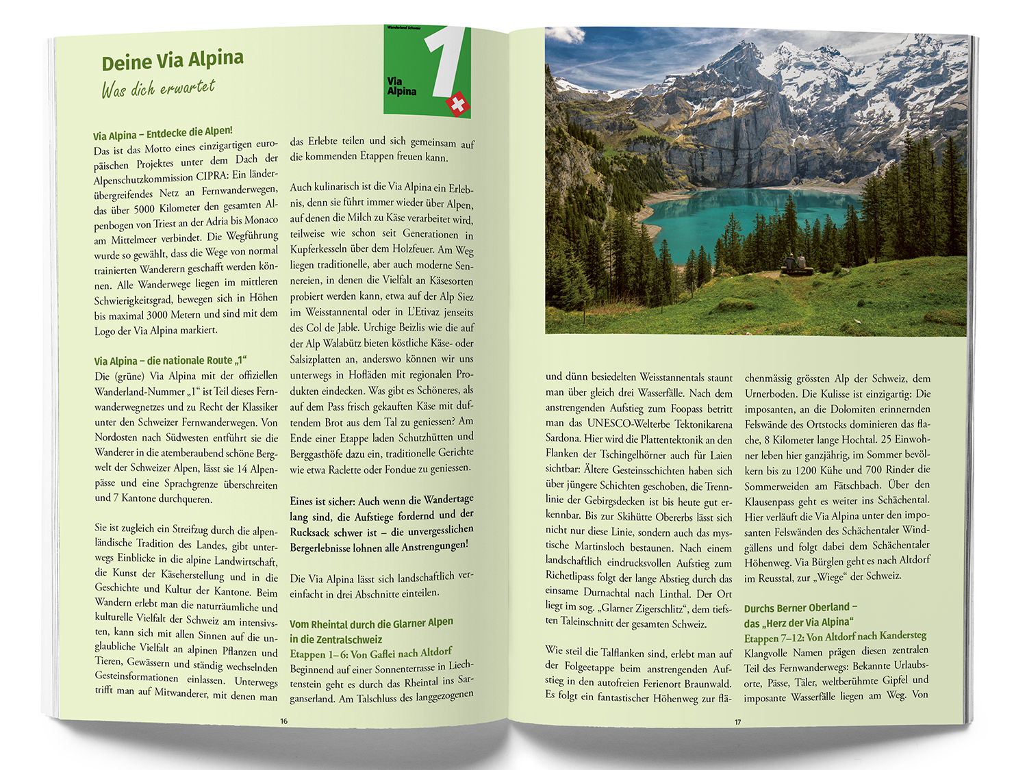 AUF 20 ETAPPEN UND FAST 390 KM geht es von Vaduz in Liechtenstein einmal quer durch die Schweiz auf dem grünen Weg der Via Alpina bis Montreux. Die zum großen Teil Hochgebirgstour, auf der man 14 Alpenpässe überquert, führt vorbei an malerischen Dörfern und bietet atemberaubende Blicke auf die Schweizer Alpen.