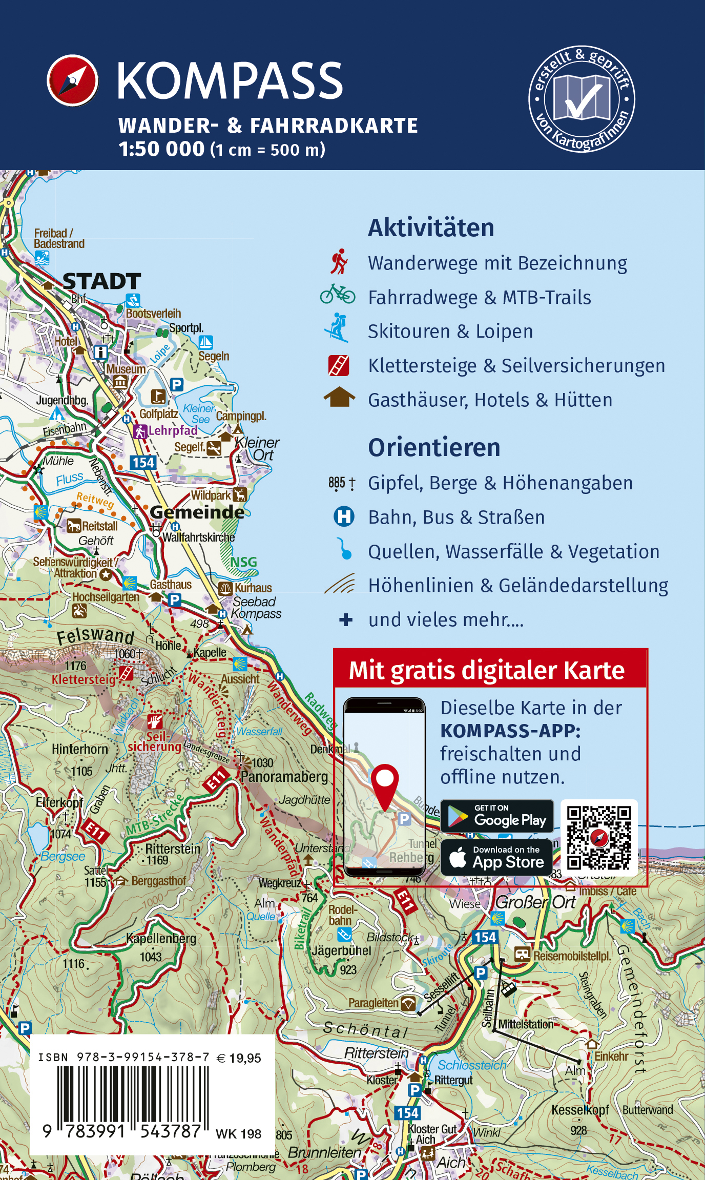 Kompass Wanderkarten-Sets decken eine ganze Region mit mehreren Karten ab. Sie sind einfach zu lesen und beinhalten trotzdem alle Informationen, die man für eine perfekte Wandertour, eine Fahrradrunde oder einen Ausflug benötigt. Sie bilden die Natur im passenden Maßstab ab. Unzählige zusätzliche Informationen werden vom Kartografie-Team laufend geprüft und erweitert. Die präzise Kartografie beinhaltet alle offiziellen Wanderwege mit Namen und Wegnummer (wie Fernwege), Fahrradwege (mit Trails), Klettersteige, Gasthäuser und Hütten, Parkplätze, Bus & Bahn, Skitouren und Loipen, Quellen, Badeplätze und vieles mehr. Das macht die Karte ideal zum Entdecken neuer Ziele, zum Planen von Touren und zum Orientieren unterwegs. Ein intuitives Kartenbild der Landschaft entsteht durch die abgebildete Vegetation, Höhenlinien, Felszeichnung sowie der Schummerung (Schattenwurf) der Berge.