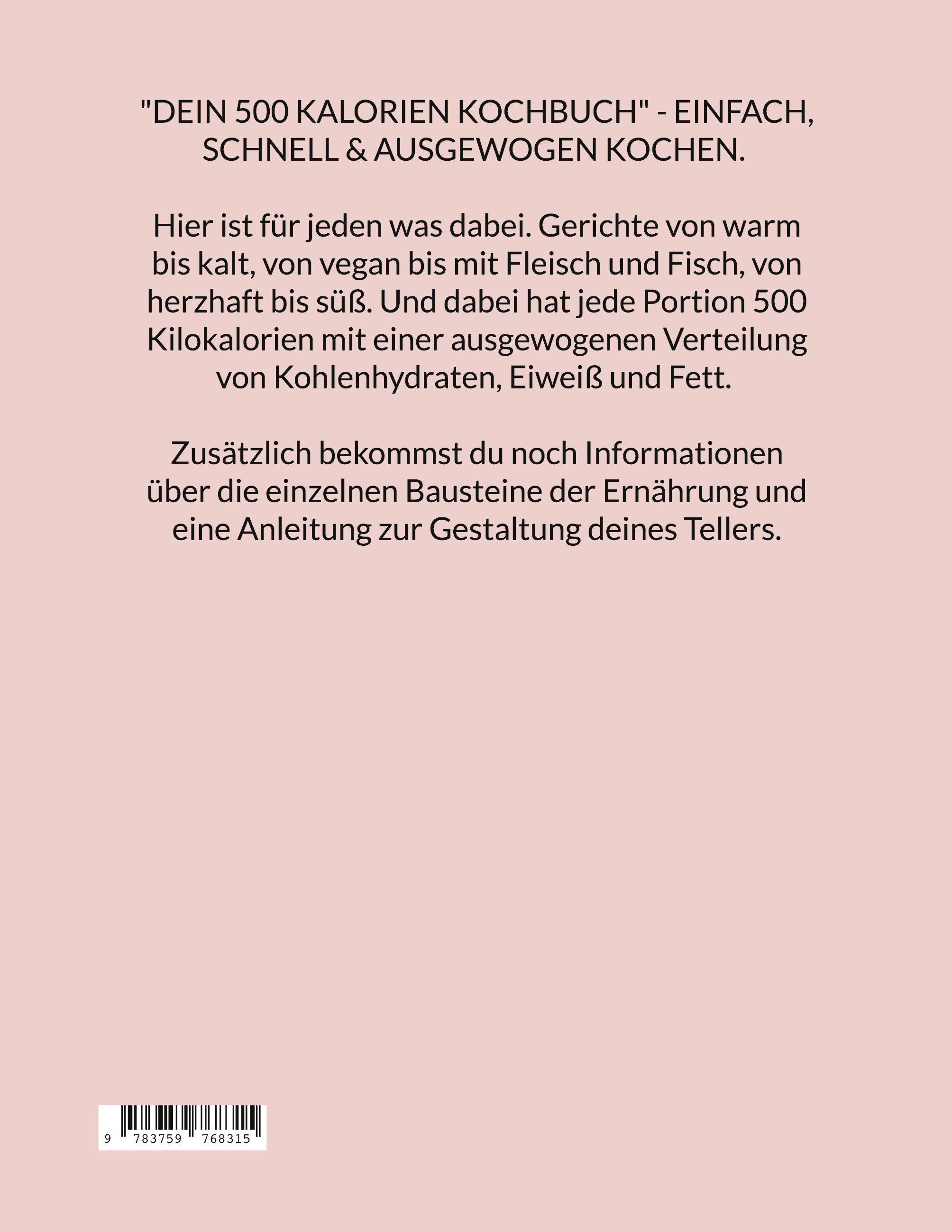 In "Deinem 500 Kalorien Kochbuch" findest du eine Vielfalt an schnellen und einfachen Rezepten: Von warm bis kalt, von vegan bis mit Fleisch und Fisch, von herzhaft bis süß. Dabei sind die Gerichte für je 1 Portion mit 500 Kilokalorien ausgelegt und enthalten eine ausgewogene Verteilung von Kohlenhydraten, Eiweiß und Fetten. On top bekommst du noch Informationen über die einzelnen Bausteine der Ernährung und eine Anleitung zur Gestaltung deines optimalen Tellers.