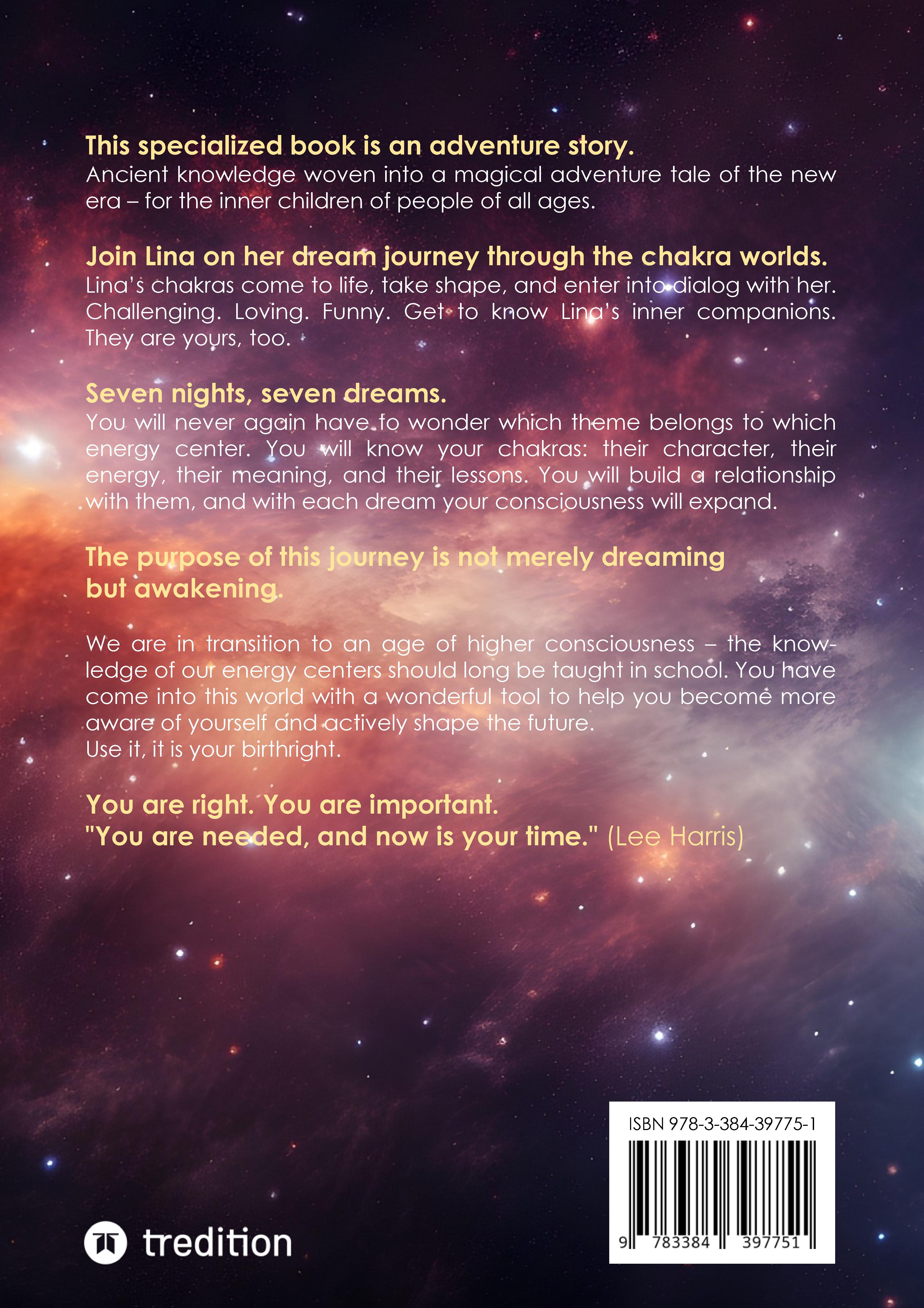 There are countless chakra books out there, but none are like this one. This specialized book waves ancient knowledge into a magical adventure tale of the new era - for the inner children of people of all ages.Join Lina on her dream journey through the chakra worlds. Seven nights, seven dreams. Lina's chakras come to life, take shape, and enter into dialogue with her. Challenging. Loving. Funny. Get to know Lina's inner companions. They are yours, too.You will never again have to wonder which theme belongs to which energy center. You will know your chakras: their character, their energy, their meaning, and their lessons. You will build a relationship with them and with each dream your consciousness will expand. The purpose of this journey is not merely dreaming but awakening.Parents, teachers, therapists: Read it with your protégés, so they remember - or never forget - how wonderful they are.The chakra system is a tool that does not need to be acquired or earned. It was given to all of us. Chakras are energy and consciousness vortices in your subtle body. The transmission of chakra teachings comes from the Indian yoga tradition, but you do not need to be a yogi to perceive your energy centers.The seven main chakras vibrate along your spine and provide their energy to your various bodily functions, as well as your psychological and spiritual processes. Especially when you are on a quest for meaning and ask yourself, "Who am I? Where do I come from? What am I here for?", engaging with your energy system will help you sense the personal answers to these questions. Each chakra holds spiritual-energetic lessons for you.We are in transition to an age of higher consciousness - the knowledge of our energy centers should long be taught in school. You have come ino this world with a wonderful tool to help you become more aware of yourself and actively shape the future. Use it; it is your birthright.You are right. You are important. "You are needed, and now is your time." (Lee Harris)