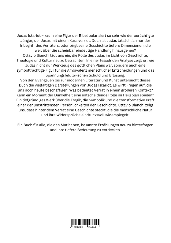 Judas Iskariot - kaum eine Figur der Bibel polarisiert so sehr wie der berüchtigte Jünger, der Jesus mit einem Kuss verriet. Doch ist Judas tatsächlich nur der Inbegriff des Verräters, oder birgt seine Geschichte tiefere Dimensionen, die weit über die scheinbar eindeutige Handlung hinausgehen?Ottavio Bianchi lädt uns ein, die Rolle des Judas im Licht von Geschichte, Theologie und Kultur neu zu betrachten. In einer fesselnden Analyse zeigt er, wie Judas nicht nur Werkzeug des göttlichen Plans war, sondern auch eine symbolträchtige Figur für die Ambivalenz menschlicher Entscheidungen und das Spannungsfeld zwischen Schuld und Erlösung.Von den Evangelien bis zur modernen Literatur und Kunst untersucht dieses Buch die vielfältigen Darstellungen von Judas Iskariot. Es wirft Fragen auf, die uns noch heute beschäftigen: Was bedeutet Verrat in einem größeren Kontext? Kann ein Moment der Dunkelheit eine entscheidende Rolle im Heilsplan spielen?Ein tiefgründiges Werk über die Tragik, die Symbolik und die transformative Kraft einer der umstrittensten Persönlichkeiten der Geschichte. Ottavio Bianchi zeigt uns, dass hinter dem Verrat eine Geschichte steckt, die die menschliche Natur und ihre Widersprüche eindrucksvoll widerspiegelt.Ein Buch für alle, die den Mut haben, bekannte Erzählungen neu zu hinterfragen und ihre tiefere Bedeutung zu entdecken.