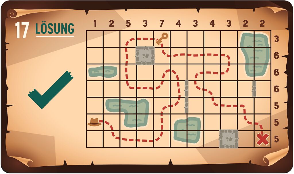 Auf diesen 40 Rätselkarten begibt man sich auf die Mission nach dem Goldschatz. Dabei müssen Hindernisse überwunden und der Schlüssel zur Schatztruhe gefunden werden, um am Ende des Logikrätsels die Schatztruhe mit dem Gold zu finden. Die wiederbeschreibbaren Karten können immer wieder gerätselt werden. Außerdem gibt es 3 unterschiedliche Schwierigkeitsgrade - von leicht bis schwer.