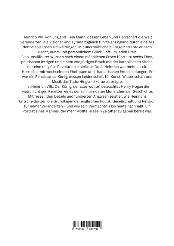 Heinrich VIII. von England - ein Mann, dessen Leben und Herrschaft die Welt veränderten. Als Visionär und Tyrann zugleich führte er England durch eine Ära der beispiellosen Umwälzungen. Mit unermüdlichem Ehrgeiz strebte er nach Macht, Ruhm und persönlichem Glück - oft um jeden Preis.Sein unstillbarer Wunsch nach einem männlichen Erben führte zu sechs Ehen, politischen Intrigen und einem endgültigen Bruch mit der katholischen Kirche, der eine religiöse Revolution einleitete. Doch Heinrich war mehr als ein Herrscher mit wechselnden Ehefrauen und dramatischen Entscheidungen. Er war ein Renaissance-König, dessen Leidenschaft für Kunst, Wissenschaft und Musik das Tudor-England kulturell prägte.In "Heinrich VIII.: Der König, der alles wollte" beleuchtet Henry Hogan die vielschichtigen Facetten eines der schillerndsten Monarchen der Geschichte. Mit fesselnden Details und fundierten Analysen zeigt er, wie Heinrichs Entscheidungen die Grundlagen der englischen Politik, Gesellschaft und Religion für immer veränderten - und wie sein Vermächtnis bis heute nachhallt. Ein Porträt eines Mannes, der mehr wollte, als sein Zeitalter zu geben bereit war.