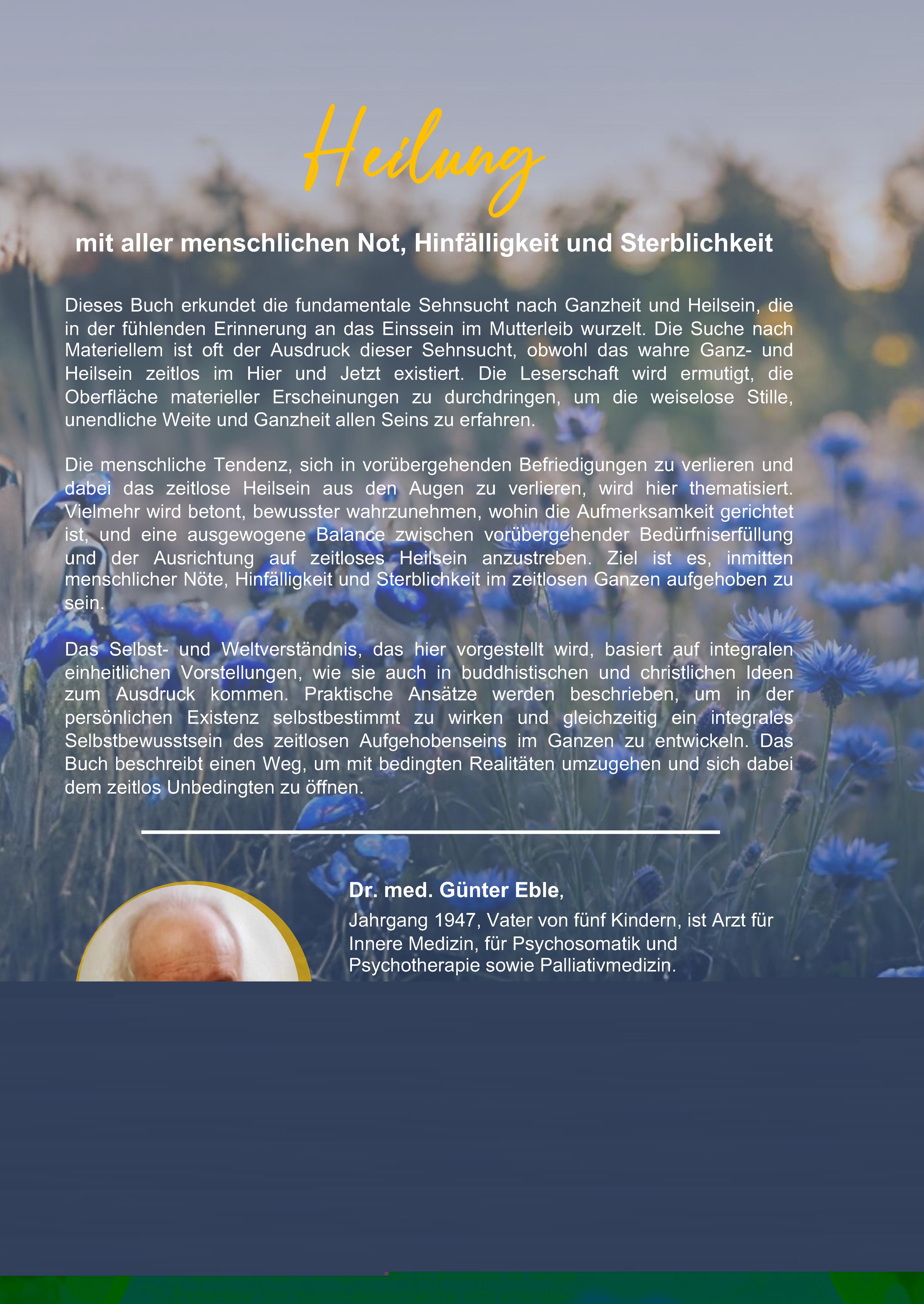 Dr. med. Günter Eble, geboren 1947, lebt in Meckenheim und ist verheirateter Vater von fünf Kindern. Mit seiner beeindruckenden beruflichen Laufbahn und einem tiefen Engagement für ganzheitliche Gesundheitsbildung verbindet er medizinisches Fachwissen mit psychotherapeutischer Expertise und spiritueller Perspektive. Nach seiner Ausbildung zum Facharzt für Innere Medizin sowie für Psychosomatik und Psychotherapie spezialisierte sich Dr. Eble zusätzlich in der Palliativmedizin. Zu Beginn seiner therapeutischen Laufbahn arbeitete er in der tiefenpsychologischen und analytischen Psychotherapie. Durch Weiterbildungen in hypno-systemischen und energiepsychologischen Verfahren erweiterte er kontinuierlich seinen Ansatz und integrierte innovative Therapieformen. Eine zusätzliche Weiterbildung in Sterbebegleitung und Spiritual Care unterstreicht sein Engagement für die Begleitung von Menschen in herausfordernden Lebensphasen. Seit 1995 widmet sich Dr. Eble auch der Wissensvermittlung. In Seminaren, Kursen und Vorträgen, die er unentgeltlich anbietet, thematisiert er ganzheitliche Gesundheitsbildung mit einem besonderen Fokus auf die Einbeziehung von Spiritualität. Sein Ziel ist es, Menschen auf körperlicher, seelischer und geistiger Ebene zu stärken. Neben seiner Lehrtätigkeit führte Dr. Eble eine eigene Praxis, in der er als psychotherapeutischer Kassenarzt tätig war. Seine vielseitigen Erfahrungen und sein ganzheitlicher Blick auf Gesundheit und Lebensbegleitung machen ihn zu einem geschätzten Experten in seinem Fachgebiet.