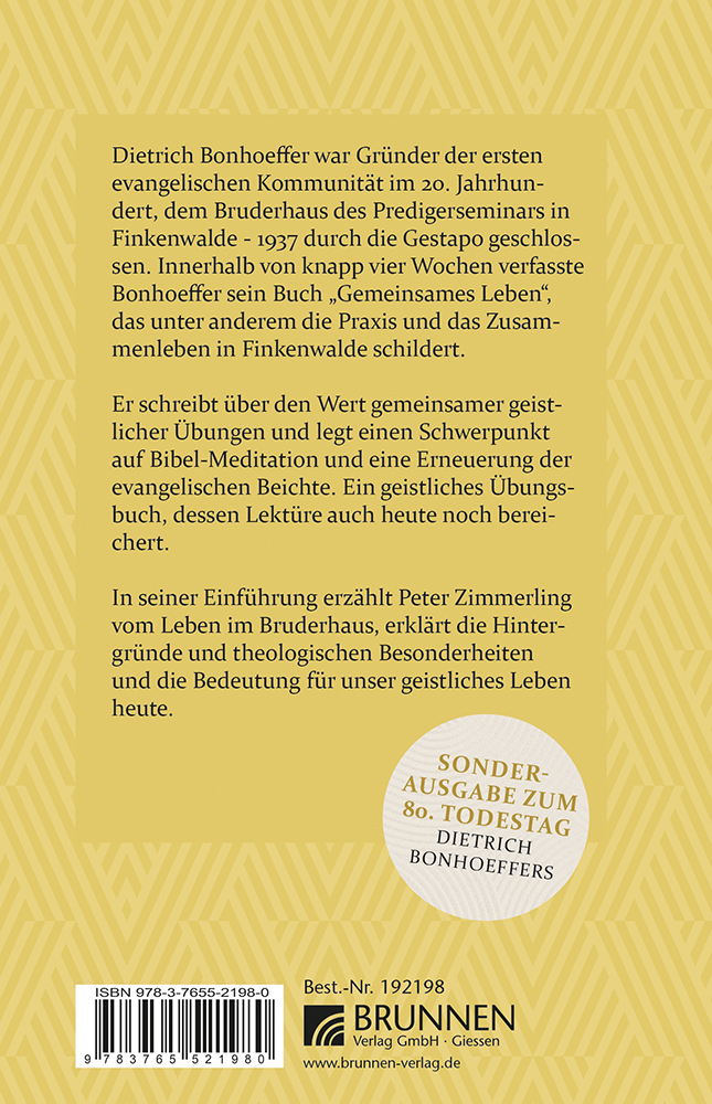 Er schreibt über den Wert gemeinsamer geistlicher Übungen und legt einen Schwerpunkt auf Bibel-Meditation und eine Erneuerung der evangelischen Beichte. Ein geistliches Übungsbuch, dessen Lektüre auch heute noch bereichert und das jeder gelesen haben sollte, der in der Gemeinschaft mit anderen Christen lebt – sei es in einer Kommunität, in der Gemeinde, dem Hauskreis oder auch in der Familie.