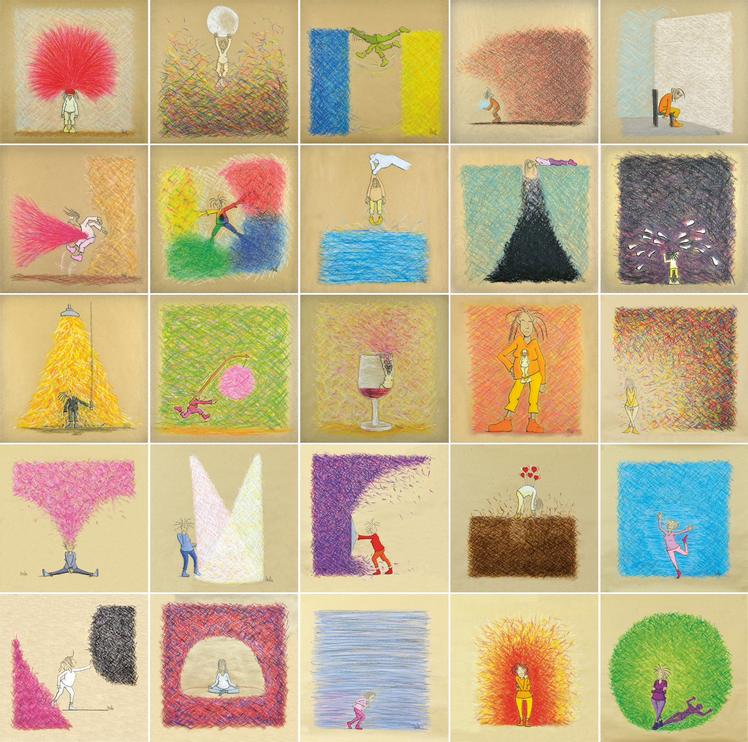 Was ist Gefühl auf Packpapier? Das sind in erster Linie mit Öl- und Wachskreide auf 50 x 50 cm großem Packpapier gezeichnete Gefühlsdarstellungen/Befindlichkeiten.