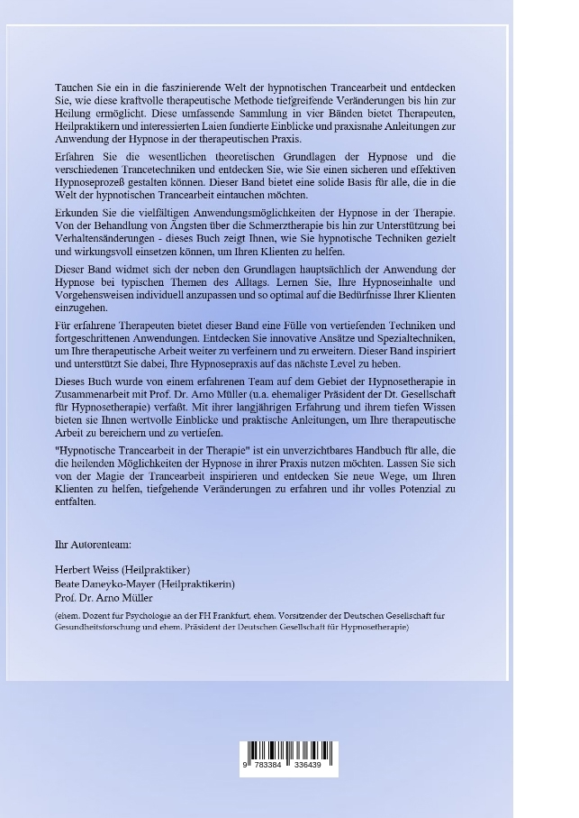Prof. Dr. Arno Müller hat Psychologie und Philosophie studiert und war ehemaliger Dozent für Psychologie an der FH Frankfurt, ehem. Vorsitzender der Deutschen Gesellschaft für Gesundheitsforschung und ehem. Präsident der Deutschen Gesellschaft für Hypnosetherapie. Die Möglichkeiten von hypnotischen Interventionen beschrieb er u.a. 2010 in seinem Buch "Das Tor zur Trance".