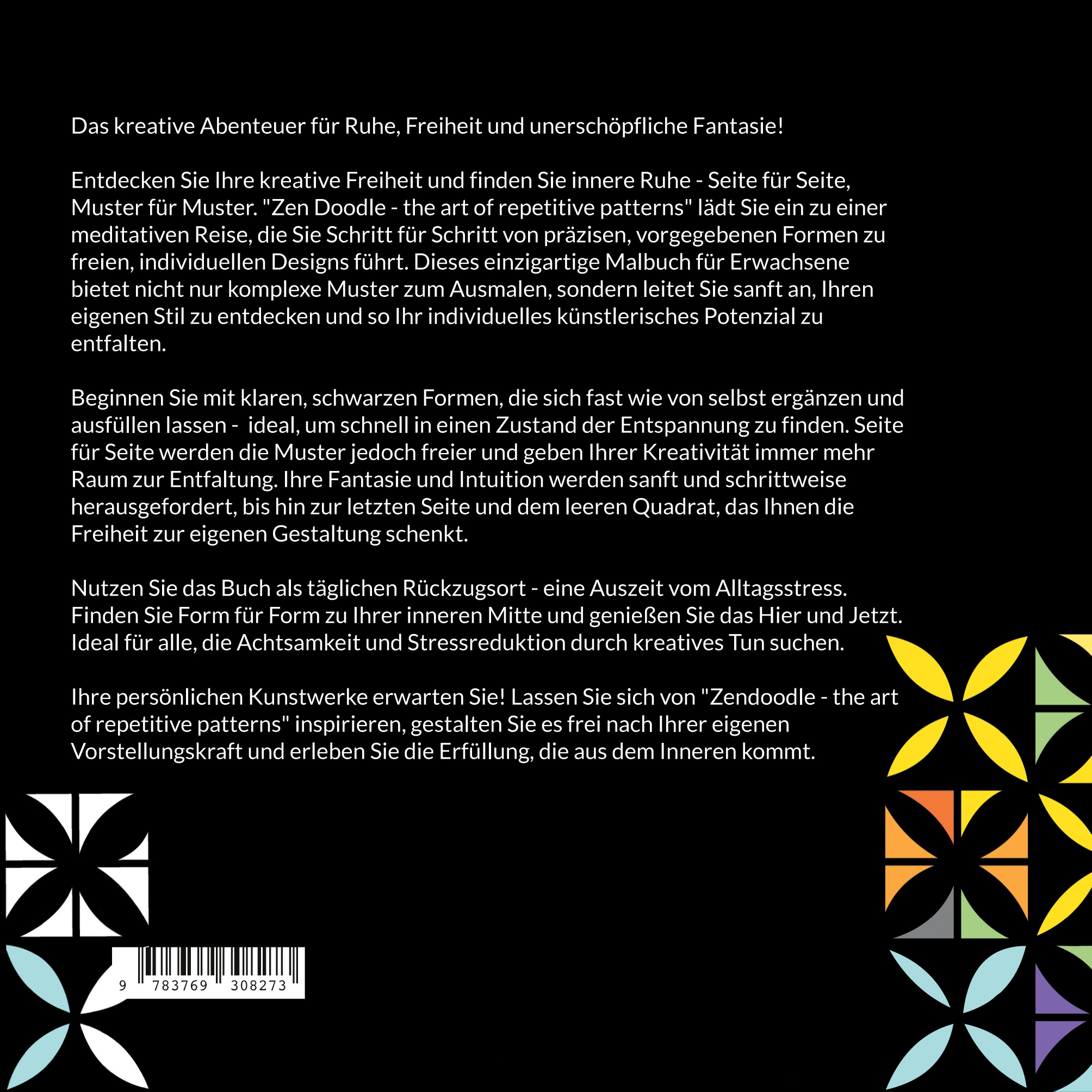 Beginnen Sie mit klaren, schwarzen Formen, die sich fast wie von selbst ergänzen und ausfüllen lassen - ideal, um schnell in einen Zustand der Entspannung zu finden. Seite für Seite werden die Muster jedoch freier und geben Ihrer Kreativität immer mehr Raum zur Entfaltung. Ihre Fantasie und Intuition werden sanft und schrittweise herausgefordert, bis hin zur letzten Seite und dem leeren Quadrat, das Ihnen die Freiheit zur eigenen Gestaltung schenkt.