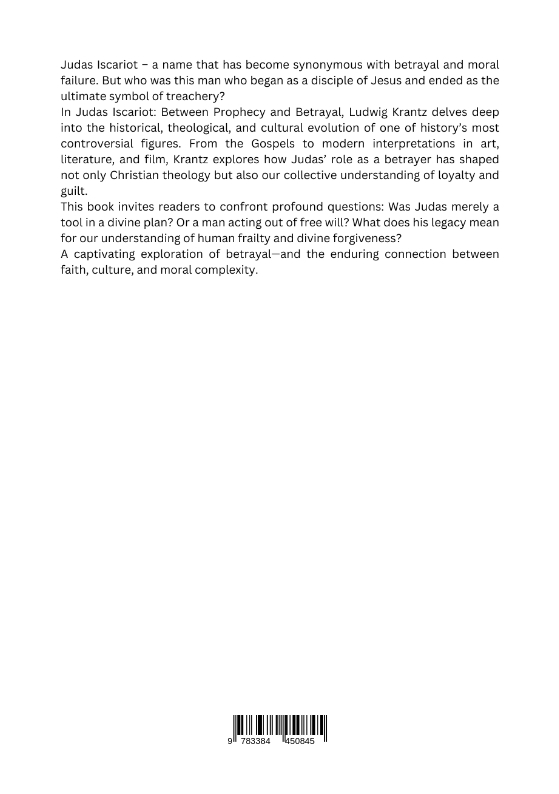 Judas Iscariot - a name that has become synonymous with betrayal and moral failure. But who was this man who began as a disciple of Jesus and ended as the ultimate symbol of treachery?In Judas Iscariot: Between Prophecy and Betrayal, Ludwig Krantz delves deep into the historical, theological, and cultural evolution of one of history's most controversial figures. From the Gospels to modern interpretations in art, literature, and film, Krantz explores how Judas' role as a betrayer has shaped not only Christian theology but also our collective understanding of loyalty and guilt.This book invites readers to confront profound questions: Was Judas merely a tool in a divine plan? Or a man acting out of free will? What does his legacy mean for our understanding of human frailty and divine forgiveness?A captivating exploration of betrayal-and the enduring connection between faith, culture, and moral complexity.