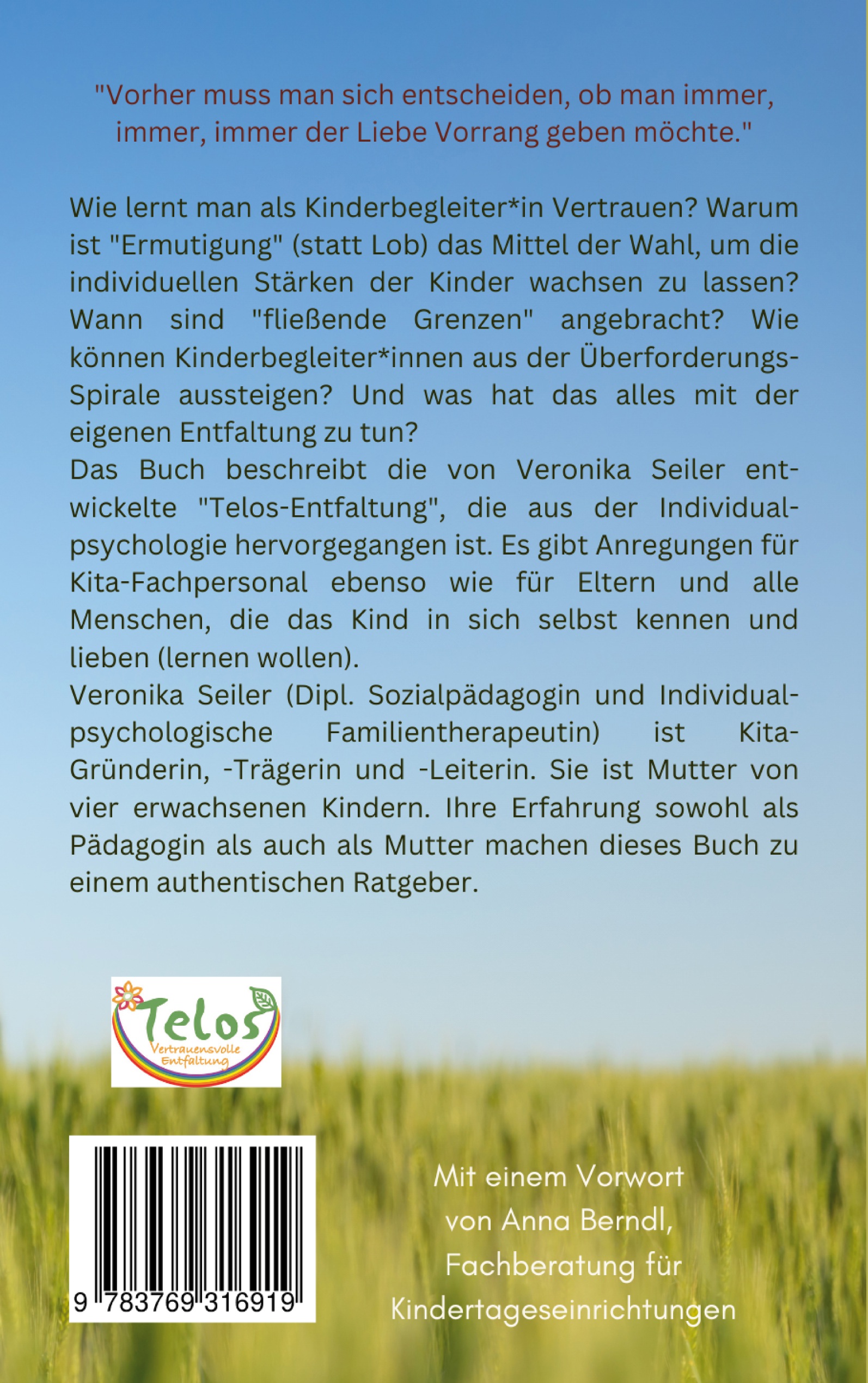 Veronika Seiler hat 1997 eine Kita gegründet. Das Buch beschreibt die Art, Kinder entfaltend zu begleiten statt zu erziehen. In diesem Buch werden Methoden beschrieben, Kinder auf eine Art zu begleiten, die der begleitenden Erwachsenen selbst Power und Entspannung ermöglicht.