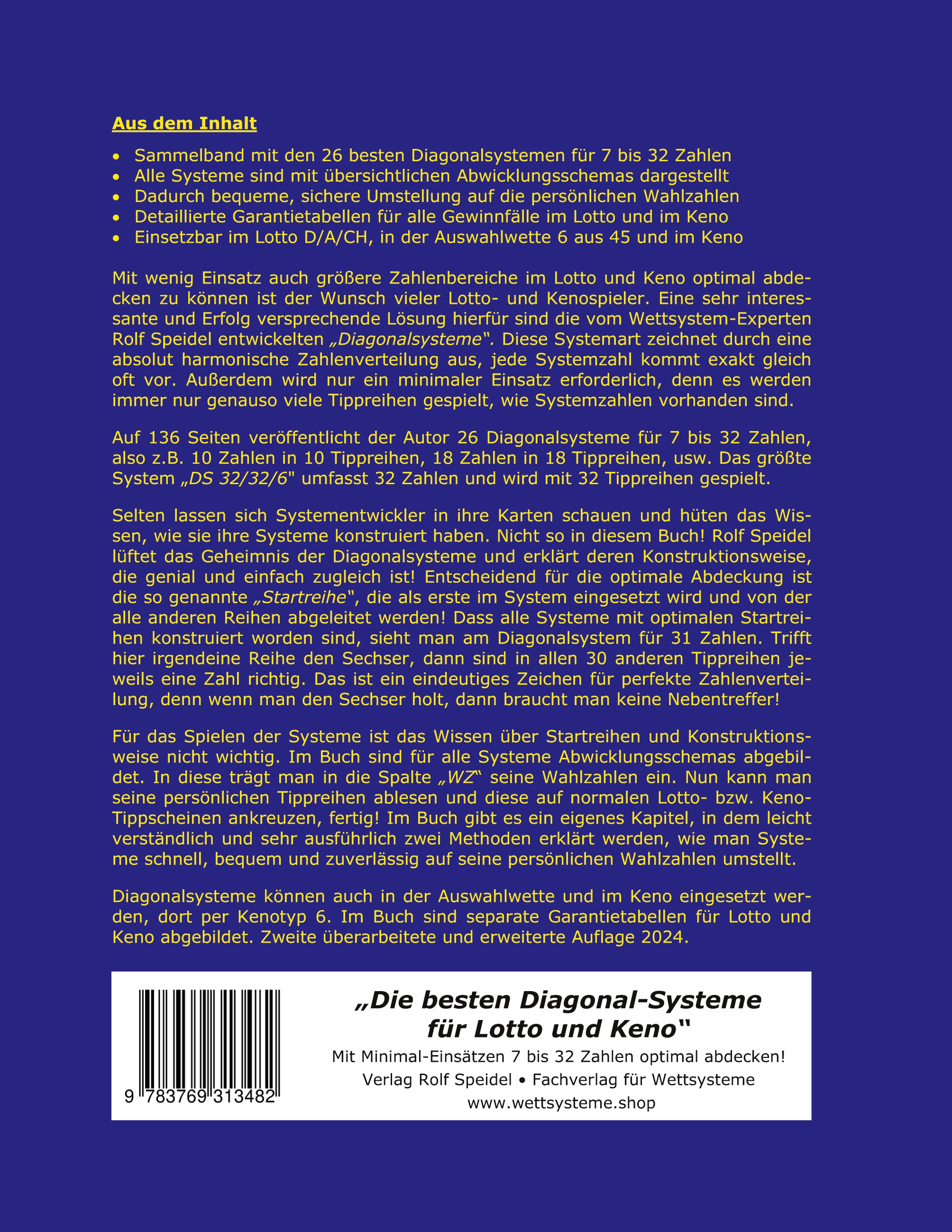 Auf 136 Seiten veröffentlicht der Autor insgesamt 26 Diagonalsysteme für 7 bis 32 Zahlen, also z.B. 10 Zahlen in 10 Tippreihen, 18 Zahlen in 18 Tippreihen, usw. Das größte System "DS 32/32/6" umfasst 32 Zahlen und wird mit 32 Tippreihen gespielt.