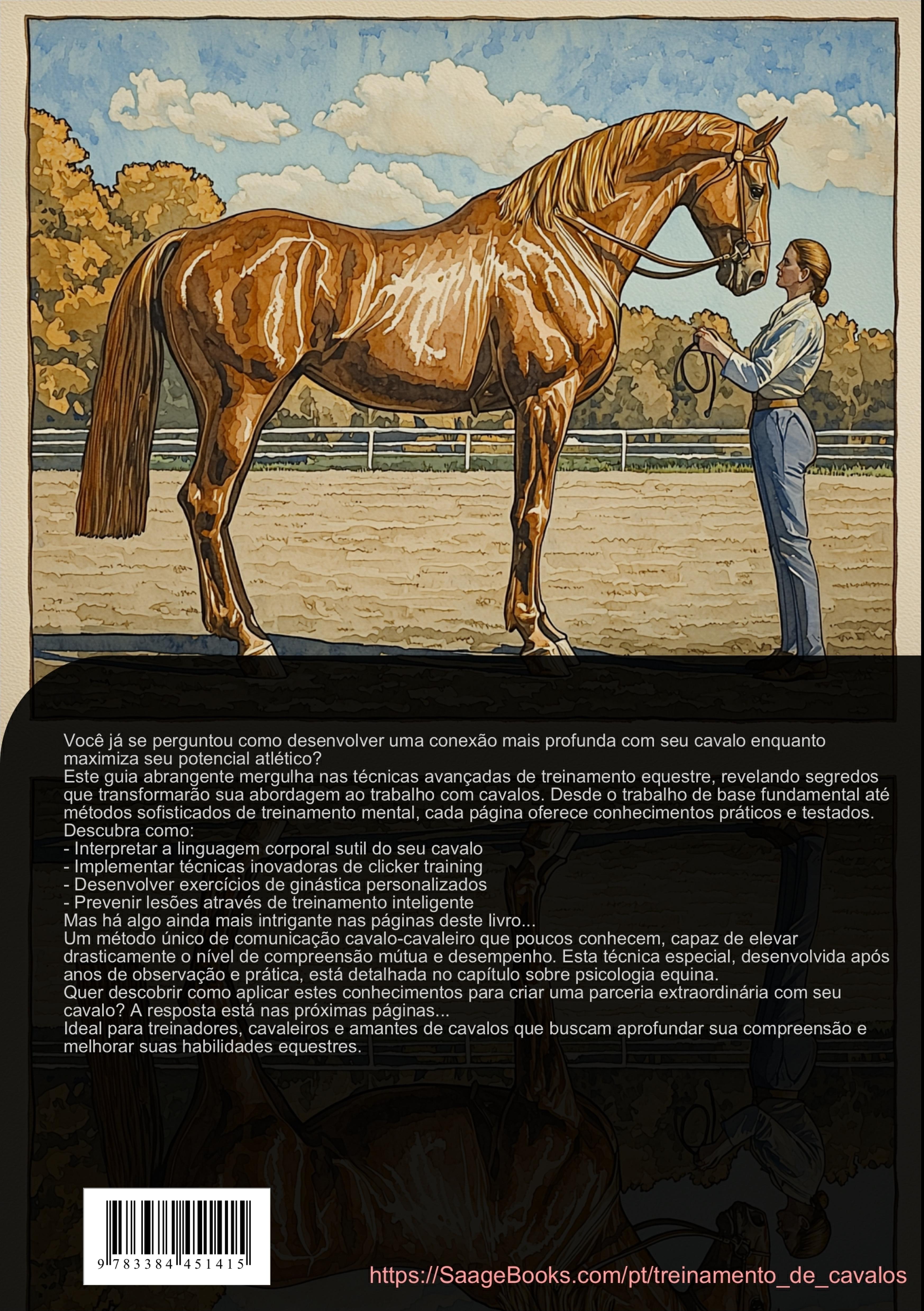 Bem-vindo ao guia abrangente sobre treinamento avançado de equinos, uma obra dedicada a aprofundar seus conhecimentos sobre técnicas modernas de equitação e bem-estar equino.Este livro apresenta métodos práticos e eficazes para desenvolver uma parceria harmoniosa com seu cavalo, abordando desde fundamentos essenciais até técnicas avançadas de treinamento. Você aprenderá sobre:- Trabalho de base detalhado, incluindo exercícios fundamentais e linguagem corporal equina- Técnicas avançadas de treinamento, como clicker training e trabalho com varas- Ginástica equina e desenvolvimento muscular adequado- Aspectos psicológicos do treinamento de caballos brincar- Métodos de comunicação efetiva entre cavaleiro e cavaloO livro também aborda aspectos importantes como:- Seleção e uso adequado de botas de equitação e equipamentos- Nutrição específica para cavalos atletas- Prevenção de lesões e cuidados com a saúde- Exercícios de aquecimento e relaxamento- Técnicas de equitacion progressivasCada capítulo foi desenvolvido para proporcionar uma compreensão profunda dos conceitos, complementada por instruções passo a passo e dicas práticas. O conteúdo abrange tanto aspectos físicos quanto mentais do treinamento equino, garantindo um desenvolvimento equilibrado do cavalo.Ideal para treinadores, cavaleiros e proprietários de cavalos que buscam aprimorar suas habilidades e compreender melhor seus equinos, este guia oferece conhecimento valioso para estabelecer uma base sólida no treinamento avançado de cavalos.Este livro foi criado com o uso de tecnologias inovadoras, como Inteligência Artificial e ferramentas especialmente desenvolvidas - por exemplo, na geração de ideias, pesquisa, escrita, edição, garantia de qualidade e design de ilustrações decorativas.Desta forma, queremos oferecer-lhe uma experiência de leitura particularmente coerente, moderna e de ainda maior qualidade.