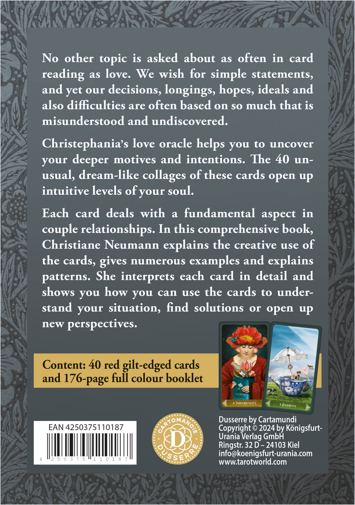 No other topic is asked about as often in card reading as love. We wish for simple statements, and yet our decisions, longings, hopes, ideals and also difficulties are often based on so much that is misunderstood and undiscovered. Christephania,s love oracle helps you to uncover your deeper motives and intentions. The 40 unusual, dream-like collages of these cards open up intuitive levels of your soul. Each card deals with a fundamental aspect in couple relationships. In this comprehensive book, Christiane Neumann explains the creative use of the cards, gives numerous examples and explains patterns. She interprets each card in detail and shows you how you can use the cards to understand your situation, find solutions or open up new perspectives.