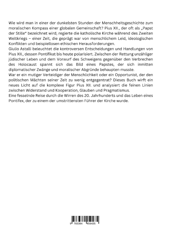 Wie wird man in einer der dunkelsten Stunden der Menschheitsgeschichte zum moralischen Kompass einer globalen Gemeinschaft? Pius XII., der oft als "Papst der Stille" bezeichnet wird, regierte die katholische Kirche während des Zweiten Weltkriegs - einer Zeit, die geprägt war von menschlichem Leid, ideologischen Konflikten und beispiellosen ethischen Herausforderungen.Giulio Astalli beleuchtet die kontroversen Entscheidungen und Handlungen von Pius XII., dessen Pontifikat bis heute polarisiert. Zwischen der Rettung unzähliger jüdischer Leben und dem Vorwurf des Schweigens gegenüber den Verbrechen des Holocaust spannt sich das Bild eines Papstes, der sich inmitten diplomatischer Zwänge und moralischer Abgründe behaupten musste.War er ein mutiger Verteidiger der Menschlichkeit oder ein Opportunist, der den politischen Mächten seiner Zeit zu wenig entgegentrat? Dieses Buch wirft ein neues Licht auf die komplexe Figur Pius XII. und analysiert die feinen Linien zwischen Widerstand und Kooperation, Glauben und Pragmatismus.Eine fesselnde Reise durch die Wirren des 20. Jahrhunderts und das Leben eines Pontifex, der zu einem der umstrittensten Führer der Kirche wurde.