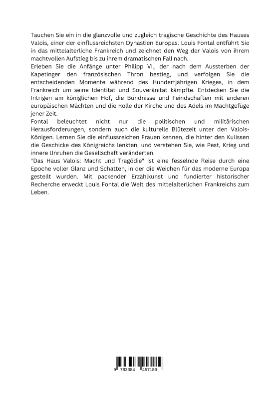 Tauchen Sie ein in die glanzvolle und zugleich tragische Geschichte des Hauses Valois, einer der einflussreichsten Dynastien Europas. Louis Fontal entführt Sie in das mittelalterliche Frankreich und zeichnet den Weg der Valois von ihrem machtvollen Aufstieg bis zu ihrem dramatischen Fall nach.Erleben Sie die Anfänge unter Philipp VI., der nach dem Aussterben der Kapetinger den französischen Thron bestieg, und verfolgen Sie die entscheidenden Momente während des Hundertjährigen Krieges, in dem Frankreich um seine Identität und Souveränität kämpfte. Entdecken Sie die Intrigen am königlichen Hof, die Bündnisse und Feindschaften mit anderen europäischen Mächten und die Rolle der Kirche und des Adels im Machtgefüge jener Zeit.Fontal beleuchtet nicht nur die politischen und militärischen Herausforderungen, sondern auch die kulturelle Blütezeit unter den Valois-Königen. Lernen Sie die einflussreichen Frauen kennen, die hinter den Kulissen die Geschicke des Königreichs lenkten, und verstehen Sie, wie Pest, Krieg und innere Unruhen die Gesellschaft veränderten."Das Haus Valois: Macht und Tragödie" ist eine fesselnde Reise durch eine Epoche voller Glanz und Schatten, in der die Weichen für das moderne Europa gestellt wurden. Mit packender Erzählkunst und fundierter historischer Recherche erweckt Louis Fontal die Welt des mittelalterlichen Frankreichs zum Leben.